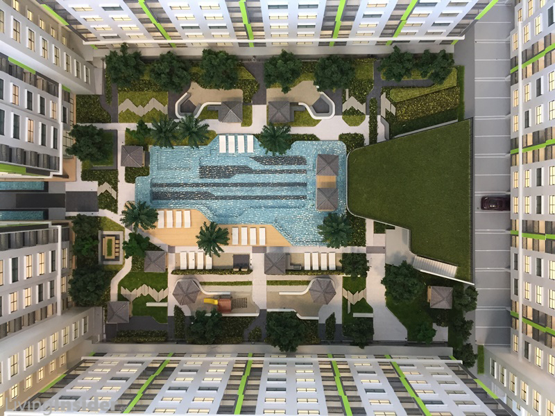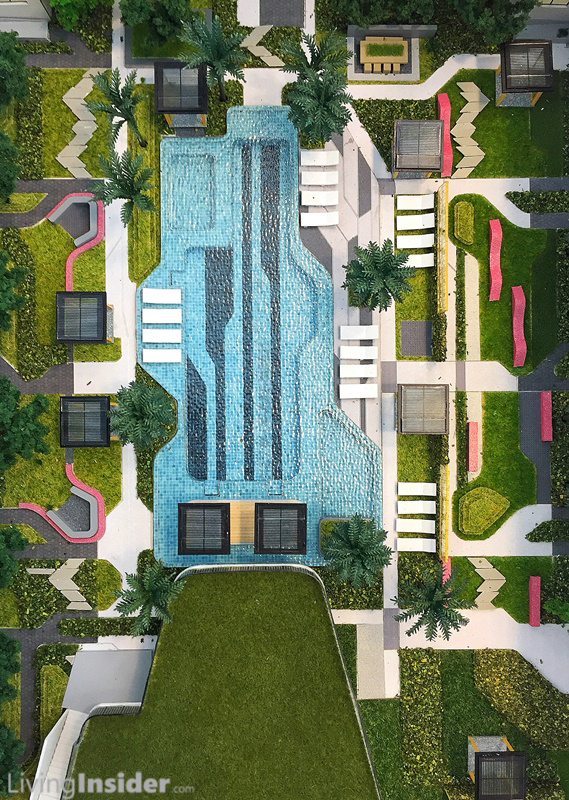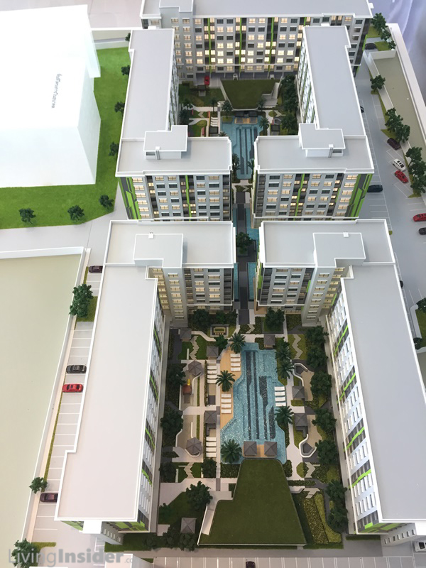 จัดวางพื้นที่ส่วนกลางไว้ตรงกลางโดยมีอาคารโอบล้อม แบบนี้จะช่วยบังแดดได้ด้วยครับ มาเล่นน้ำกันตอนกลางวันยังได้