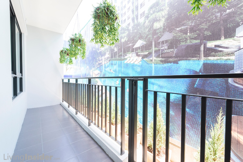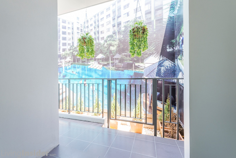 ห้องแบบนี้เป็นยูนิตพิเศษ อยู่ชั้นล่างสุดของอาคาร B1 มีระเบียงกว้างเชื่อมต่อกับส่วนกลาง ให้อารมณ์คล้ายบ้านเลยครับ แบบเดินออกไปก็เป็นสวนหน้าบ้านได้เลย โครงการมีปลูกพุ่มไม้หน้าระเบียง เพิ่มความเป็นส่วนตัวให้ด้วย