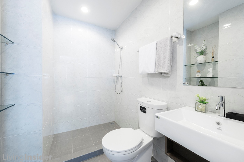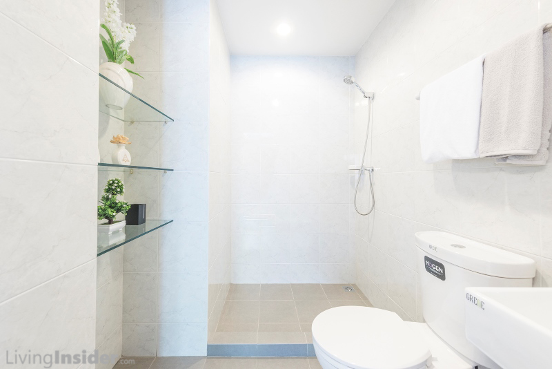 ห้องน้ำมาตรฐาน สุขภัณฑ์ครบ ปูกระเบื้องลายหินอ่อนทั้งห้อง ดูดีมากทีเดียว