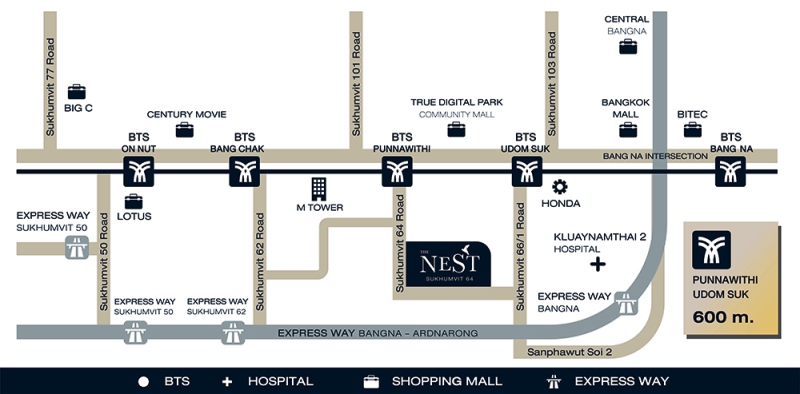 ทำเล The Nest สุขุมวิท 64 สามารถเข้าทั้งจากซอยสุขุวิท 64 ซึ่งปากซอยเป็น BTS ปุณณวิถี และซอยสุขุมวิท 66/1 ซึ่งปากซอยเป็น BTS อุดมสุข ที่ผมว่าสะดวกมากๆและเป็นจุดเด่นของซอยนี้ก็คือ สำหรับการใช้รถส่วนตัวคุณจะสามารถใช้ทางด่วนได้สะดวกมากๆครับ ตอบโจทย์ Mixed-Transportation Mode