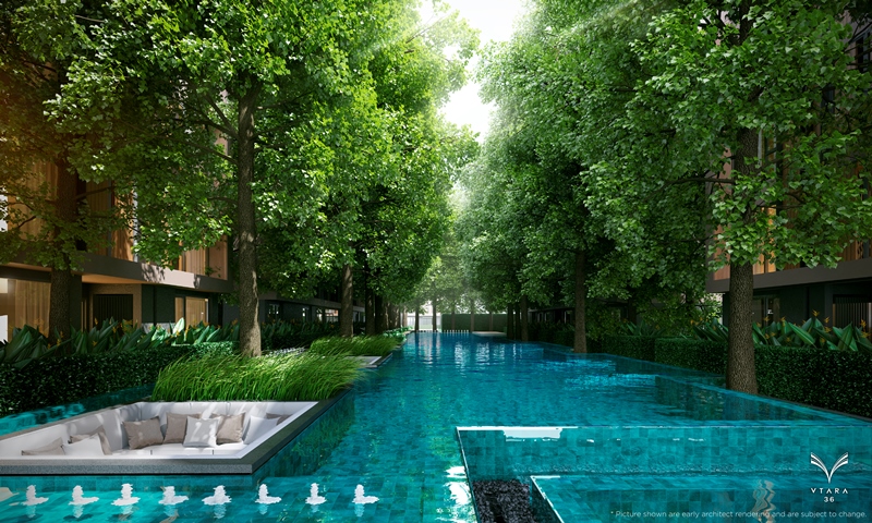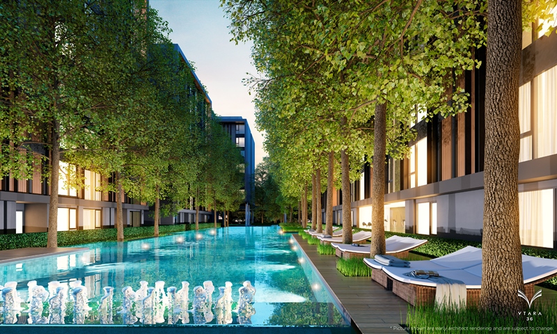 โดยอาคารที่พักอาศัยจะโอบล้อมสระว่ายน้ำขนาดใหญ่ตรงกลาง ซึ่งสระว่ายน้ำดังกล่าวกรุด้วยหินในระดับพรีเมียม นำเข้าจากต่างประเทศ ทำให้ที่สระว่ายน้ำที่นี้เป็นเหมือนสระมรกตเลยครับ ซึ่งสระว่ายน้ำที่นี่ ออกแบบในแนวคิดที่เรียกว่า Emerald Lagoon Pool เลยนะครับ และยิ่งไปกว่านั้น สระยาวจริงๆครับ ยาวถึง 80 เมตรเลย ไม่รู้ว่านี่ยาวที่สุดในสุขุมวิทมั้ย