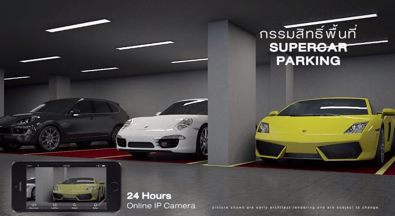 ทีเด็ดอีกอย่างที่เซลส์ภมิใจนำเสนอมาก คือ เค้าบอกว่าที่นี่ มีที่จอดรถซูเปอร์คาร์ซึ่งเป็นที่จอดรถที่ให้มากกว่าที่กฎหมายกำหนด ด้วยมาพร้อม Personal IP Camera (ระบบกล้องวงจรปิดดูแลรถคุณ 24 ชม.) โดยพื้นที่จอดรถแบบนี้สามารถซื้อได้เลย หมายความว่าจะเป็นกรรมสิทธิ์ในโฉนดของคุณไปเลย ไม่ว่าใครก็มาจอดตรงนี้ไม่ได้ ซักวันนึงผมมีซูเปอร์คาร์คงอยากได้ที่จอดรถแบบนี้แน่ๆ