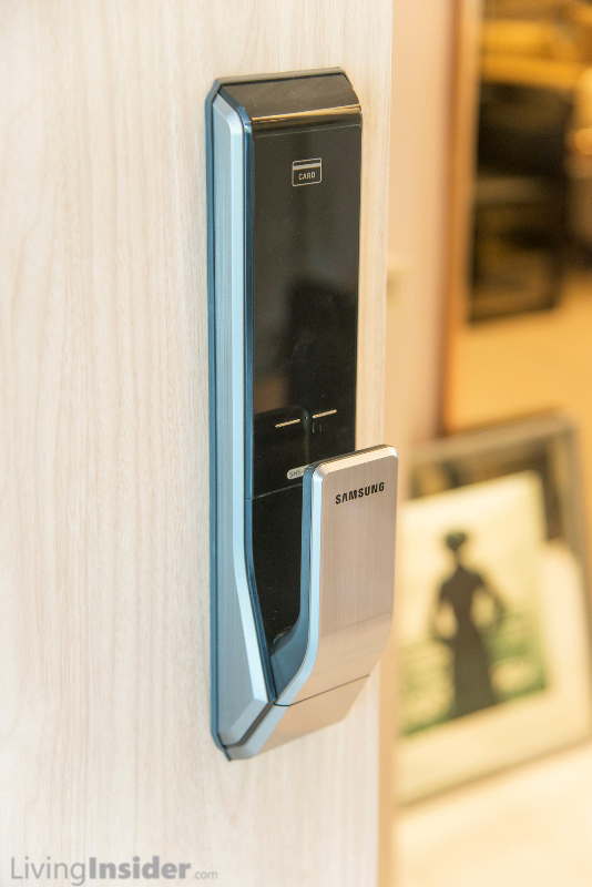 ลืมบอกไป ประตูทางเข้าทุกห้อง เค้าให้ Digital Smart Door Lock samsung ซึ่งผมขอเรียกว่าเป็น Exclusive & Intelligent Design ของ Samsung ซึ่ง Design ออกมาพร้อมกับ IR Sensor ทำให้กลอนประตูใช้งานได้ทันที เมื่อคุณเข้าใกล้ตัวเครื่องในระยะ 70 cm โดยเป็นระบบก้านแบบผลัก/ดึง (ไม่ใช้ก้านโยกเหมือนประตูทั่วๆไปตามที่อื่นๆ ซึ่งยากต่อการใช้งาน) ซึ่งเป็นข้อดีนะครับ เมื่อเวลาคุณถือของพะรุงพะรัง เดินมาก็ผลักประตูเข้าได้เลย ยิ่งไปกว่านั้นทุกห้องยังมีสัญญาณช่องทีวีของญี่ปุ่นโดยไม่ต้องไปเสียเงินค่าบริการรายเดือนหลายพันบาทครับจุดนี้ทำให้ปล่อยเช่าได้ง่ายขึ้น