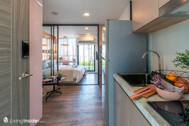 เมื่อปิดประตูห้อง จะเห็นโซนครัวขนาดเล็กพอดี ซึ่งทางโครงการจะให้ทุกอย่างตามที่เห็นในภาพ คือ บิ้วอินท์เก็บของทั้งชั้นบนและชั้นล่าง เตาไฟฟ้า 2 หัว ซิงค์ล้างจาน ยกเว้นตู้เย็นกับไมโครเวฟ