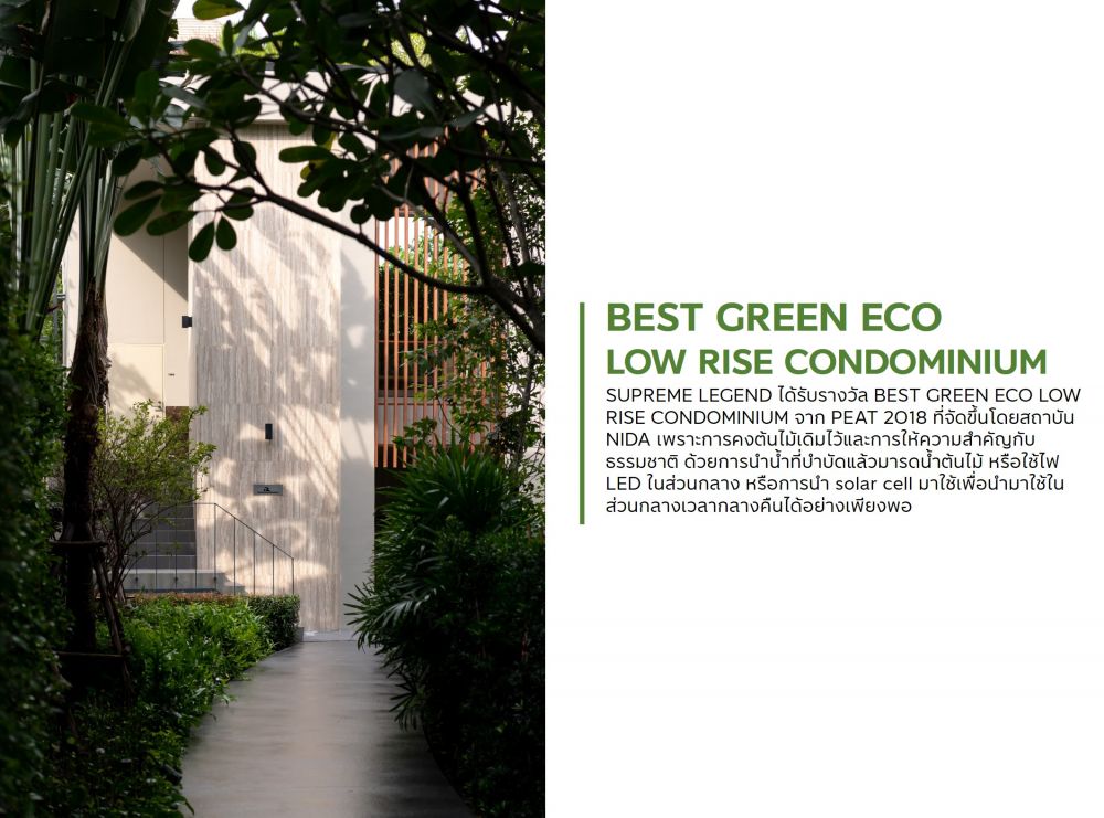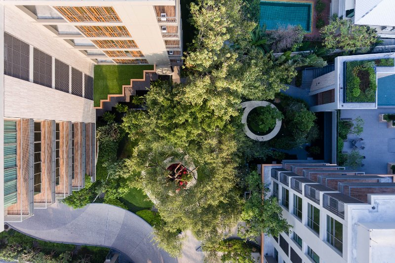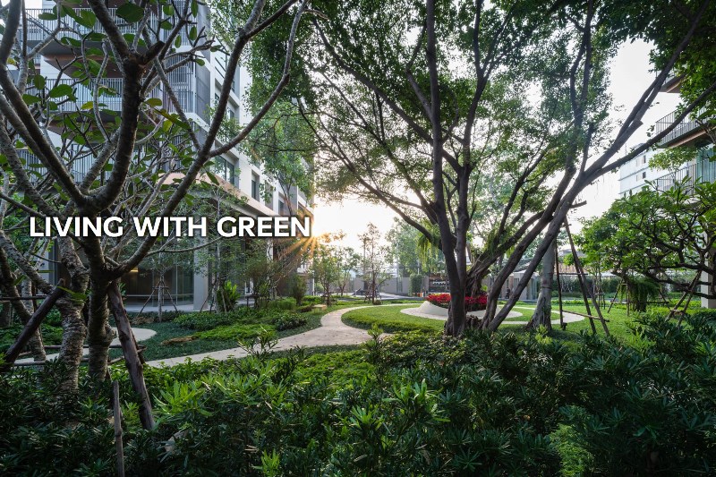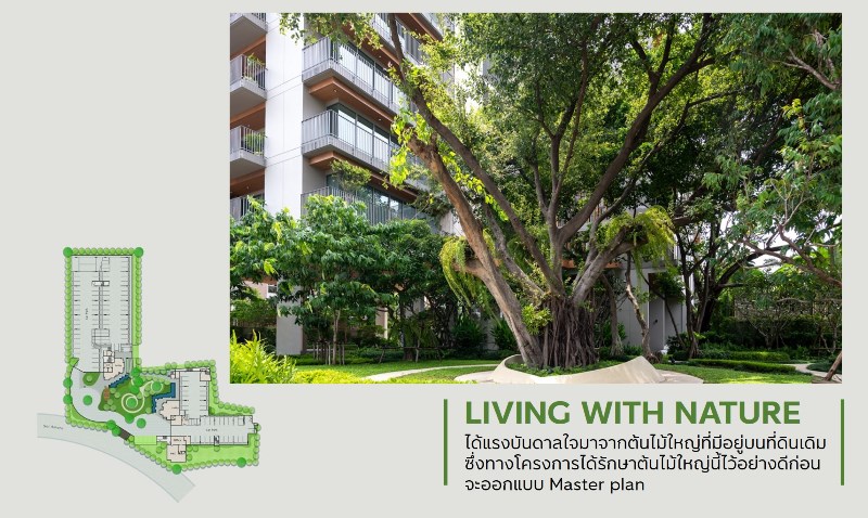ซึ่งทางโครงการได้รักษาต้นไม้ใหญ่นี้ไว้อย่างดีก่อนจะทำการออกแบบ Master plan ของโครงการ เรียกว่าไม่เพียงแค่ยืดหยุ่นลงตัวกับชีวิตเท่านั้น แต่ยังยั่งยืนทั้งต่อชีวิตเราเองและธรรมชาติรอบตัว... ซึ่งหาได้ยากในปัจจุบันนอกจากนี้ ระหว่างตัวอาคารทั้งสองอาคารคั่นด้วยสวนสีเขียวพร้อมทางเดินที่กลมกลืนกับธรรมชาติ และล้อมรอบโครงการด้วยพืชพันธุ์ไม้สีเขียว