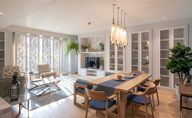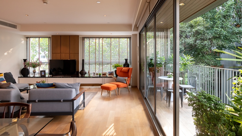 ส่วนภายในห้องพัก เราจะพาไปดูจุดไฮไลท์ที่สำคัญของห้องตัวอย่างกัน โดยเริ่มกันที่ห้องนั่งเล่น ภาพด้านล่างเป็นทั้งมุมนั่งเล่น และมุมโต๊ะทานข้าว ซึ่งจะเห็นได้ว่าทางโครงเน้นการออกแบบที่เปิดรับแสงจากธรรมชาติ พร้อมชมวิวทิวทัศน์รอบๆ ได้เต็มที่ และเพิ่มความเป็นส่วนตัวด้วยจังหวะการจัดต้นไม้ภายนอกอาคารที่สูงพอดีกับชานหลังคาที่โผล่ยื่นออกไปด้านนอกรับกันพอดี