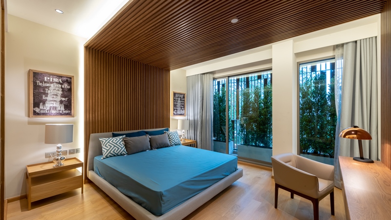 รวมทั้งการนำไม้ระแนงเข้ามาตกแต่งภายในห้องนอน... ซึ่งดูแล้วเหมือนนอนรับลมเย็นๆ อยู่ในสวน ยิ่งมีประตูกระจกเป็นแบบ Full height แล้วยิ่งทำให้รู้สึกเหมือนว่านอนอยู่ในสวนจริงๆ