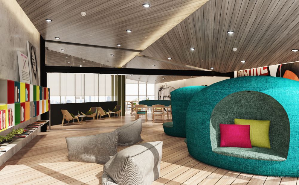 ส่วน Co-Learning Space พื้นที่พักผ่อนที่ตกแต่งออกมาได้เหมาะแก่การอ่านหนังสือหรือนั่งพักผ่อน สำหรับนักศึกษาหรือวัยทำงานที่ต้องการพื้นที่ทำงานบรรยากาศดีๆ มุมนี้ตอบโจทย์ได้เต็มๆ