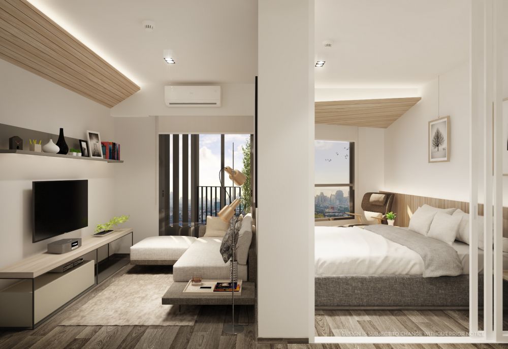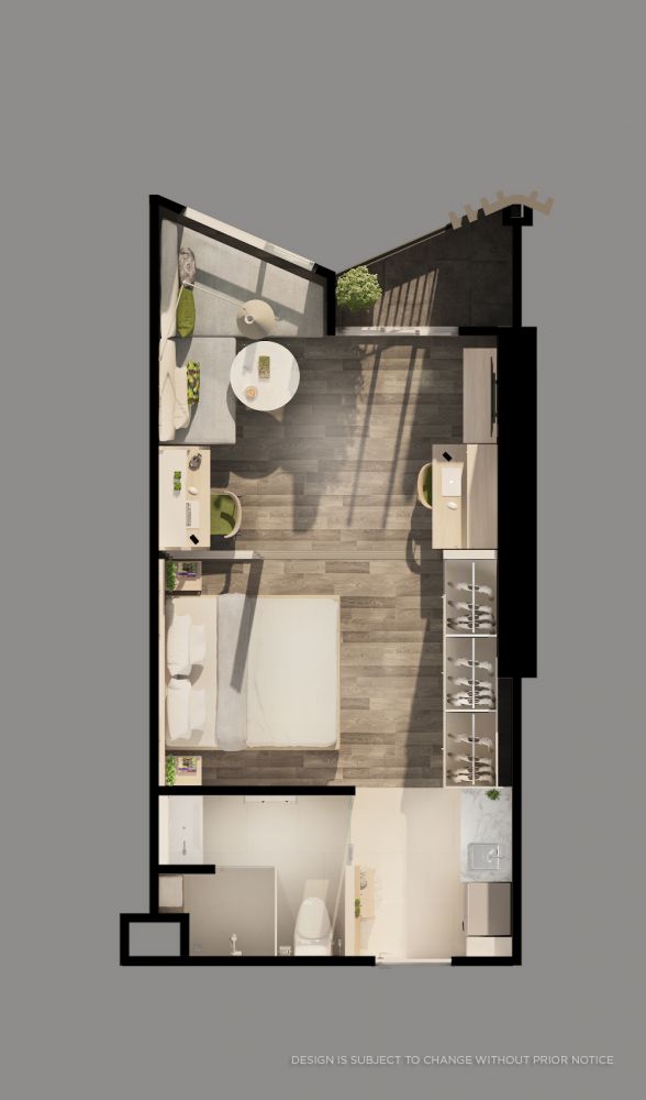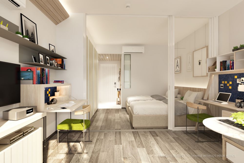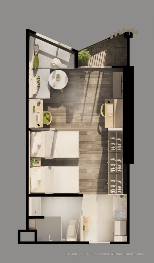 ยูนิตมาตรฐานของ Triple Y Residence คล้ายห้อง Studio ครับ เข้ามาเจอพื้นที่ครัวเล็กๆ เน้นส่วน Living เป็นหลัก บิวท์อินเตียง Twin-Bed โต๊ะทำงาน ตู้เสื้อผ้า และ Day-Bed ใช้นั่งเล่นชมวิวภายนอก เหมาะกับอาศัย 2 คน ด้วยแนวคิดการออกแบบที่คำนึงถึงการใช้ชีวิตแบบ 2 คน ด้วยการแบ่งพื้นที่ใช้สอยได้อย่างลงตัว พร้อมระเบียงดีไซน์เอียงเหมาะแก่การเทควิวภายนอกได้เป็นอย่างดี