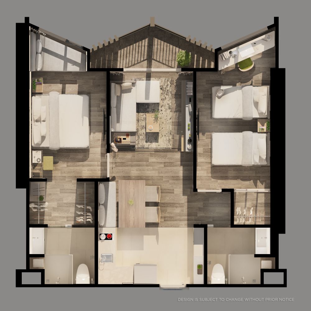 ยูนิต 2-Bedroom เป็นการรวม 1-Bedroom สองยูนิตนั่นเอง จัด Layout ใหม่ แบ่งเป็นพื้นที่ครัว - รับประทานอาหาร, นั่งเล่น ระเบียงขนาดใหญ่ ตั้งโต๊ะจิบกาแฟชมวิวเมืองได้เลย