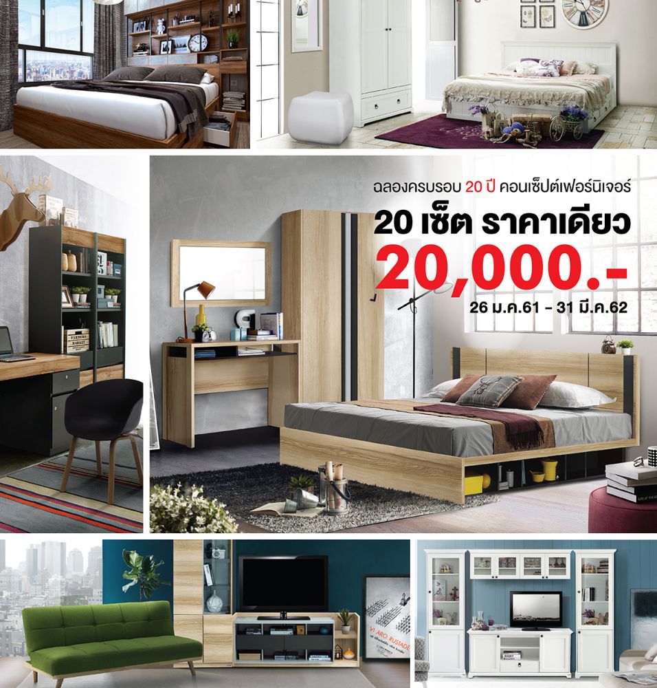แคมเปญใหม่ล่าสุดจาก Koncept เฟอร์นิเจอร์ ครบรอบ 20 ปี จัดเต็มกับเซ็ตเฟอร์นิเจอร์ถึง 20 เซ็ต ในราคาเดียวแค่ 20,000 บาท ได้ทั้งเซ็ตไม่ต้องจ่ายเพิ่ม เรียกได้ว่าคุ้มค่าสุดๆสำหรับการจะตกแต่งคอนโดสักห้อง คนรุ่นใหม่ที่กำลังหาเฟอร์นิเจอร์แต่งห้องนี่ห้ามพลาดเด็ดขาด