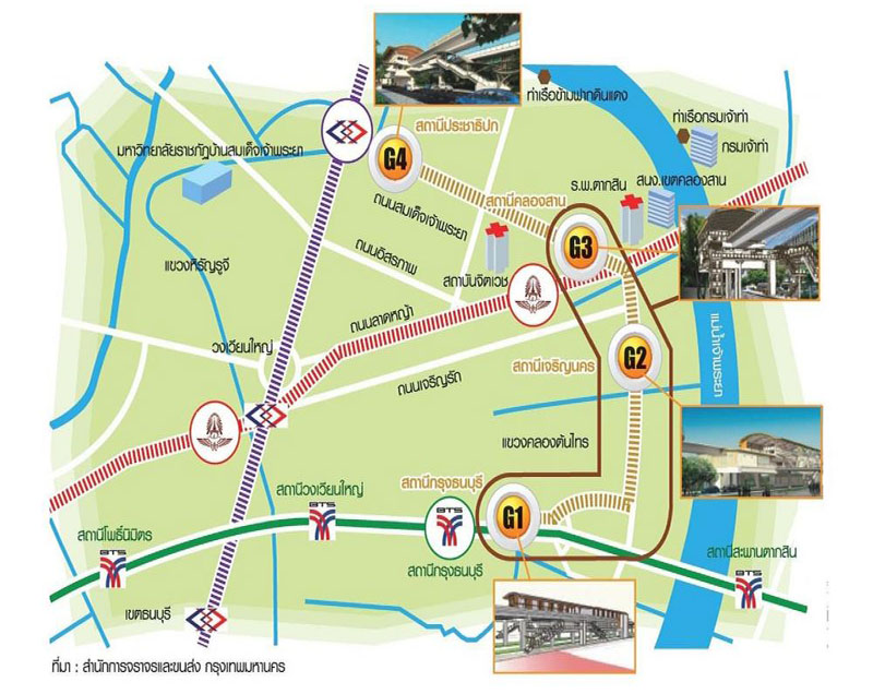สถานีกรุงธนบุรี ที่สามารถเชื่อมต่อกับรถไฟฟ้าสายสีเขียวส่วนต่อขยาย (ช่วงตากสิน-บางหว้า) สถานีกรุงธนบุรี