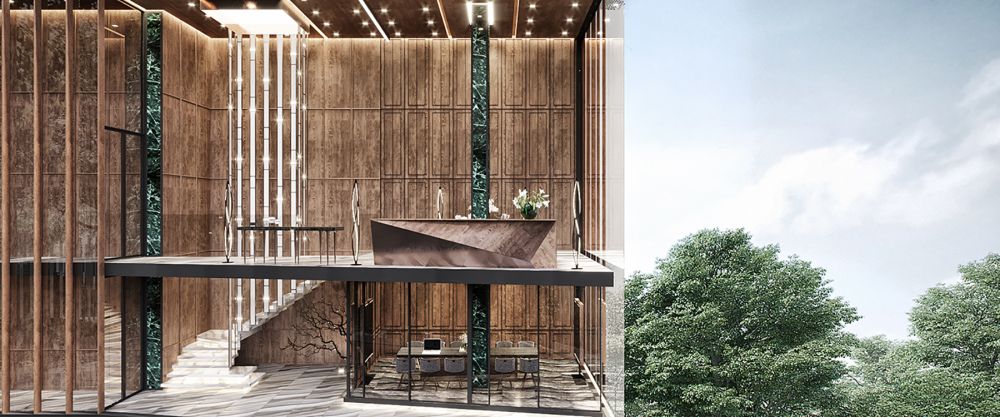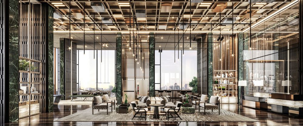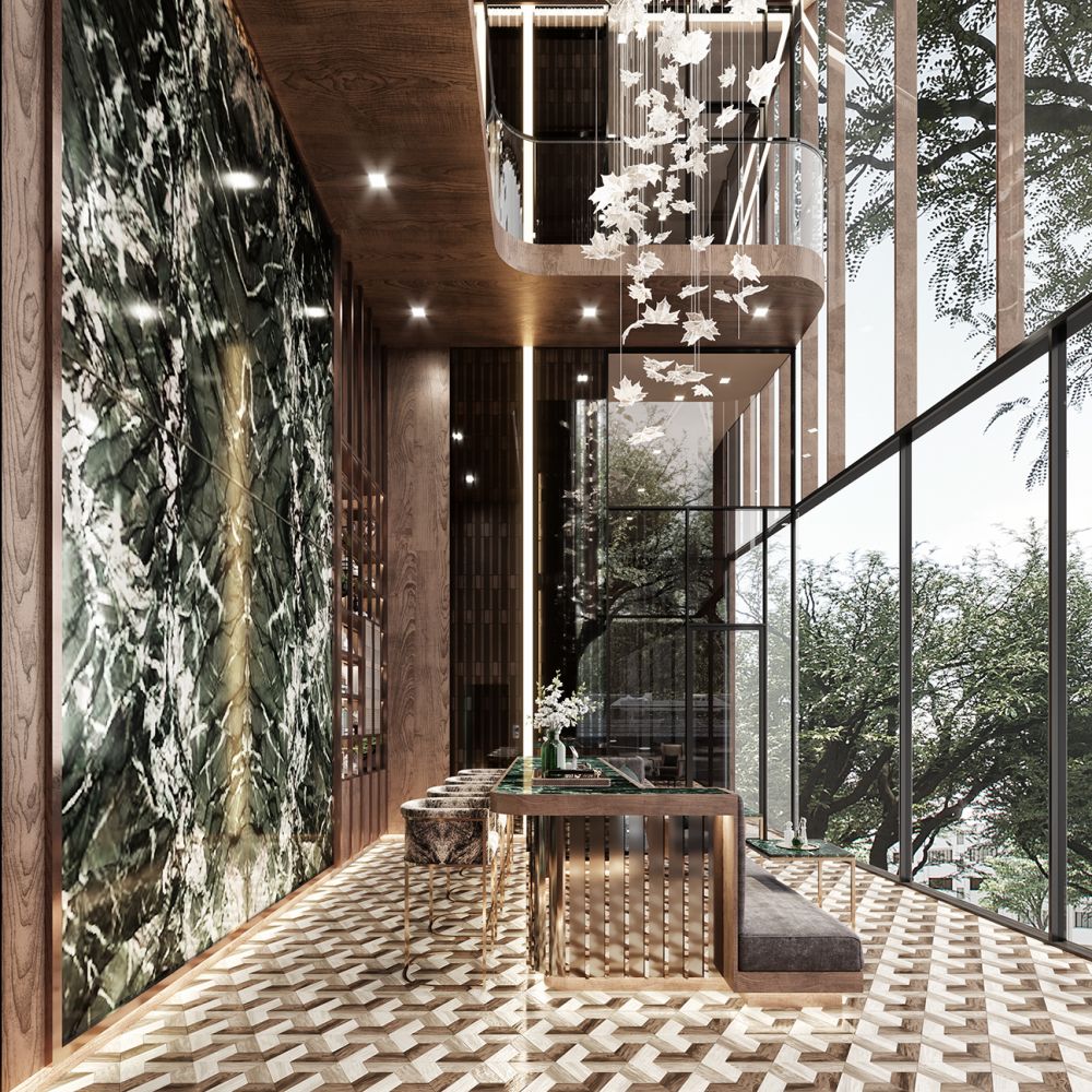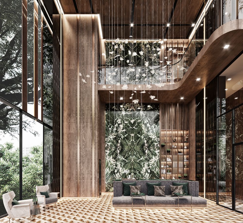 จากภาพจะเห็นความหลากหลายของวัสดุตกแต่งได้ชัดเจน ท่ามกลางวิวสีเขียวจากธรรมชาติภายนอกโครงการ พร้อมด้วยแชนเดอร์เลียห้อยระย้าขนาดใหญ่ในรูปทรง free form