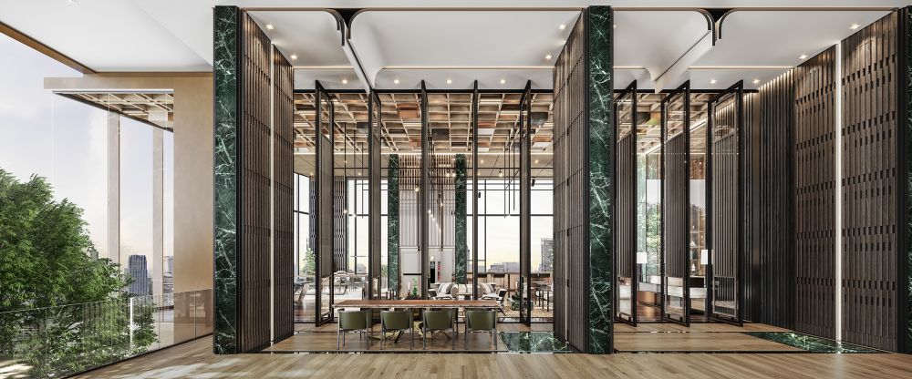 ด้วยการออกแบบพื้นที่สีเขียวที่ค่อนข้างสวยงาม ทางโครงการจึงออกแบบให้ Social Zone & Quiet Zone เป็นห้องที่มีเพดานสูง ตกแต่งด้วยหน้าต่างกระจกทรงสูงรอบทิศเพื่อเปิดรับวิวจากด้านนอก ขณะเดียวกัน ภายในห้อง Social Zone & Quiet Zone ได้ออกแบบให้ดูหรูหราด้วยวัสดุประเภทไม้ กระจกแผ่นใหญ่ ตัดด้วยกรอบอะลูมิเนียมสีทองและสีดำ ตกแต่งด้วยหินอ่อนและหินแกรนิตลวดลายแปลกตา