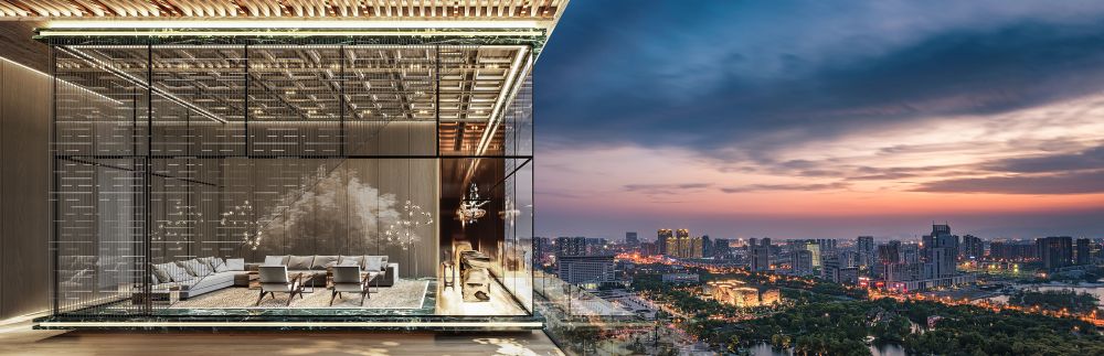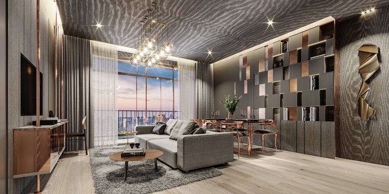 ภาพแรกเป็นมุมเจาะของโซนรับแขก ที่อยู่ติดกับริมหน้าต่างกระจกทรงสูง วัสดุภายในห้องมีทั้งพื้น Hybrid Engineering Wood ผนังตกแต่งด้วยหินแกรนิต ไม้ และอะลูมิเนียม คุมโทนน้ำตาล ครีม และความแวววับจากวัสดุประเภทอะลูมิเนียม