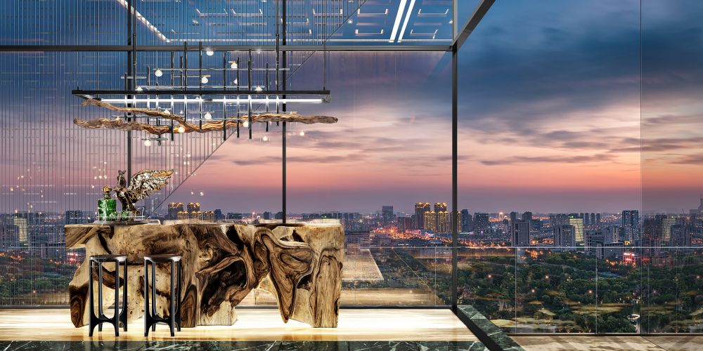 อีกมุมของ Tea Pavillion ที่โชว์ให้เห็นถึงความอลังการของวิวกรุงเทพฯ ด้วยกระจกทรงสูงบานใหญ่ ตกแต่งด้วยเคาน์เตอร์บาร์ที่ทำมาจากไม้ขนาดใหญ่โชว์ตาไม้และผิวสัมผัสแบบธรรมชาติ แถมด้วยแชนเดอร์เลียกิ่งไม้รูปทรงธรรมชาติ นำมาประดับตกแต่งด้วยหลอดไฟ ก็กลายเป็นแชนเดอร์เลียดีไซน์แปลกตาสุดๆ