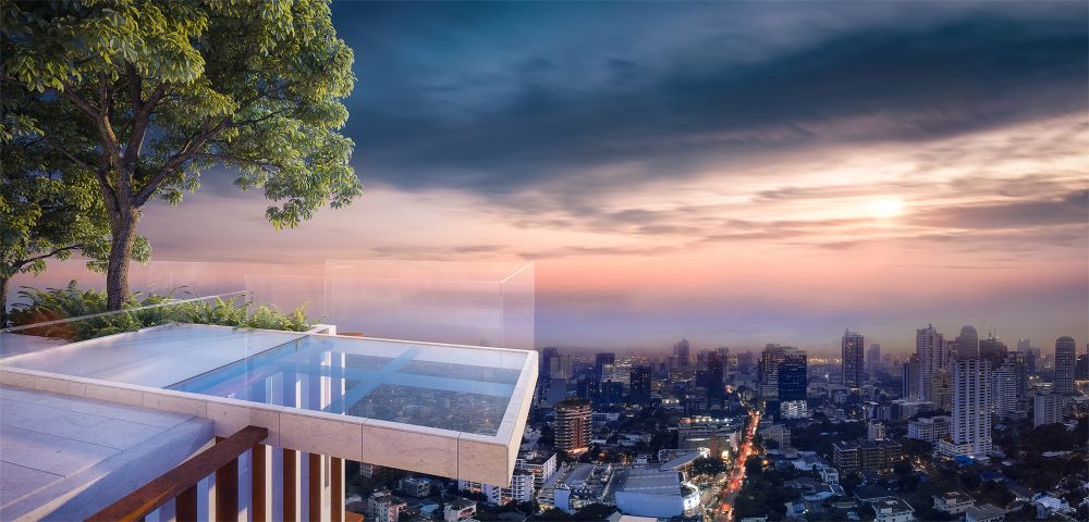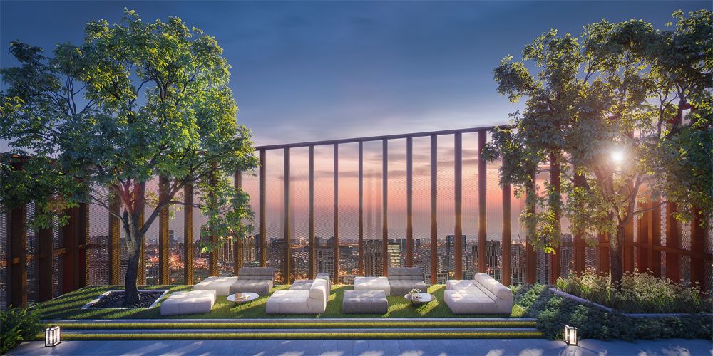 และสุดท้ายก็คือ สวนสีเขียวบนดาดฟ้าชั้นบนสุดของโครงการ จากภาพตัวอย่างด้านล่างเห็นได้ว่าทางโครงการออกแบบให้เปิดรับวิวได้แบบจัดเต็ม ในขณะที่ยังมีความปลอดภัย ด้วยการใช้กำแพงสูงที่โปร่งโล่ง มองทะลุเห็นวิวรอบๆ ได้เต็มที่ พร้อมด้วยที่นั่งพักรับชมวิวเมือง