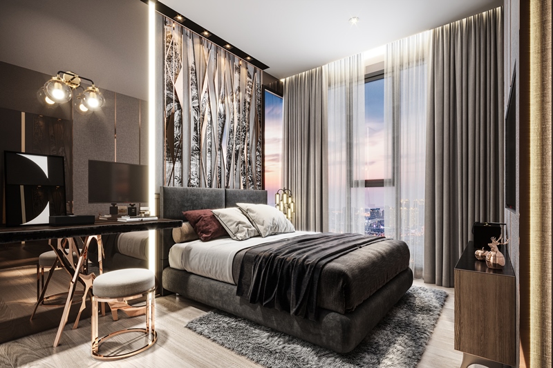 ห้องนอนเล็กที่ถือว่ายังดูหรูหราอยู่ดี ด้วยสไตล์การตกแต่ง วัสดุที่ใช้ และที่สำคัญคือมีกระจกทรงสูงเปิดรับวิวด้านนอกได้แบบจุใจ ซึ่งคงต้องรอดูกันอีกทีว่าแปลนห้องแต่ละแบบจะเป็นอย่างไร