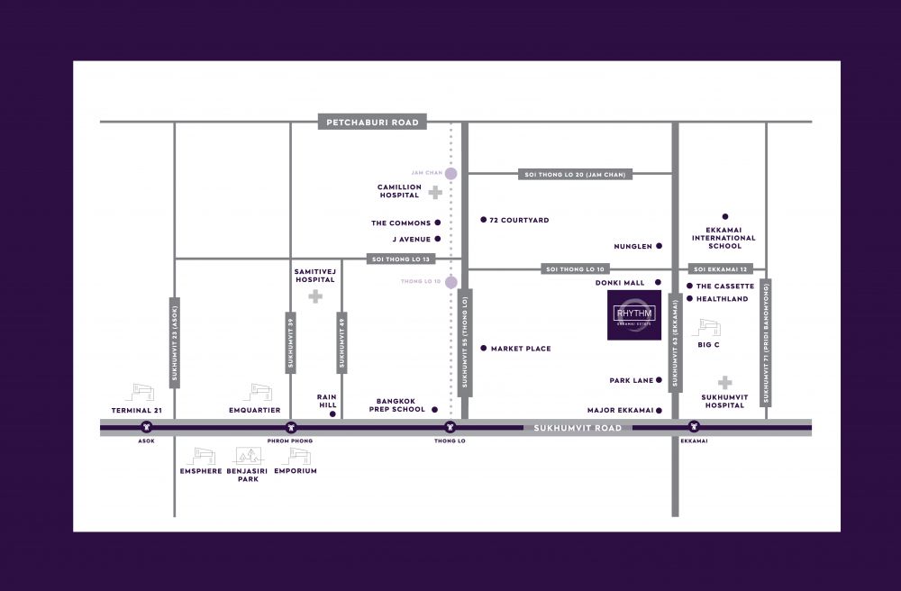 จุดขายแรกของ Rhythm Ekkamai Estate ก็ตามชื่อโครงการเลยคือ อยู่บนทำเลกลางเมือง ทำเลในฝันของคนกรุงเทพฯ อย่าง “เอกมัย” หรือซอยสุขุมวิท 63 โดยอยู่ในช่วงต้นซอยฝั่งสุขุมวิทห่างจากรถไฟฟ้าบีทีเอสสถานีเอกมัยประมาณ 1 กม.
