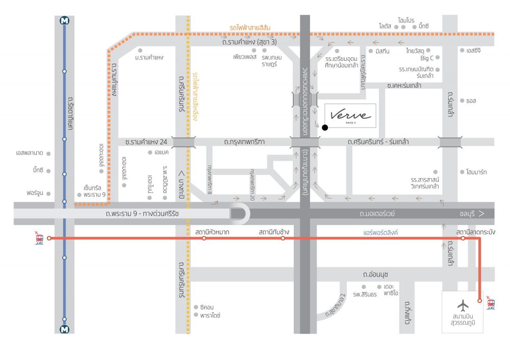 Verve พระราม 9 อยู่บริเวณ ถ.เลียบวงแหวนฯ ก่อนถึง ถ.กรุงเทพกรีฑาตัดใหม่ นิดหน่อย จากทางเข้าหลักตรงเข้ามาเรื่อยๆ จะพบกับ Venue และ Bangkok Boulevard เป็นโครงการของ SC Asset เช่นกัน อย่าลืมสังเกตป้ายหน้าโครงการนะครับ