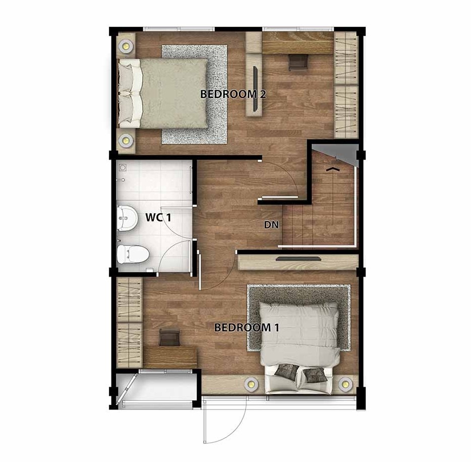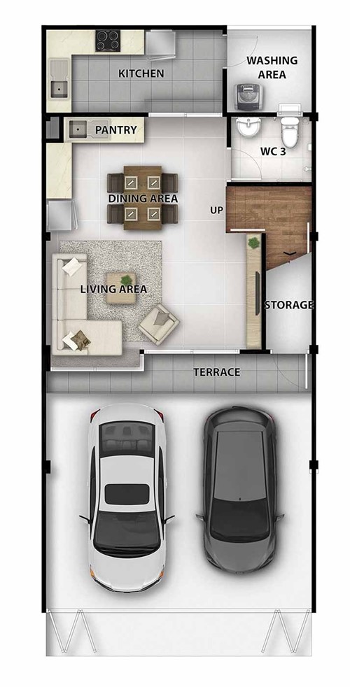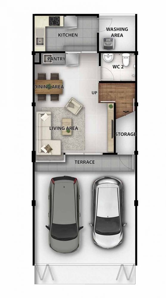 แบบบ้านมาตรฐานโครงการ หน้ากว้าง 5.5 เมตร จอดรถได้ 2 คัน จัดวาง Layout ให้ความสำคัญกับ ‘Common Area’ กว้างขวางเป็นพิเศษ เช่นเดียวกับ Bedroom (ชั้น 2) เหมาะกับครอบครัวขนาดเล็ก 2-3 คนครับ