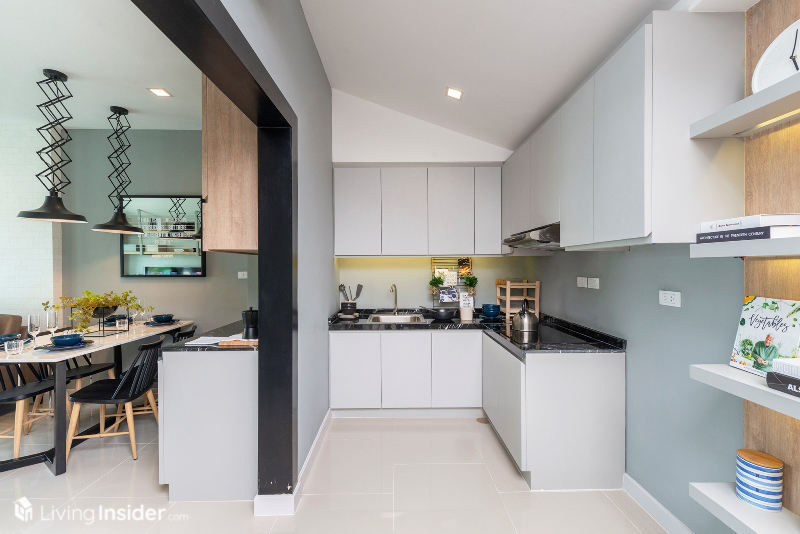 ถัดมาเป็นส่วน Pantry สำหรับเตรียมอาหารเช้า ชงกาแฟ และมีพื้นที่ให้วางโต๊ะอาหารขนาด 3-4 ที่นั่งได้