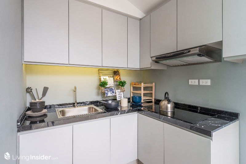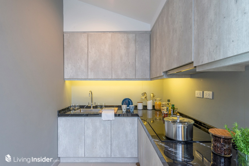 ด้านในคือพื้นที่ครัว (Kitchen) แบบตะวันตก บิวท์อินแบบ L-Shape พร้อมตู้เก็บของ Top หินสังเคราะห์ ติดตั้งเครื่องดูดควัน เตาไฟฟ้า มีอ่างล้างจานให้ ใช้ประกอบอาหารมื้อไม่ใหญ่มาก อีกฝั่งเป็นจุดซักล้าง โครงการเดินท่อ - ระบบไฟให้เรียบร้อยครับ