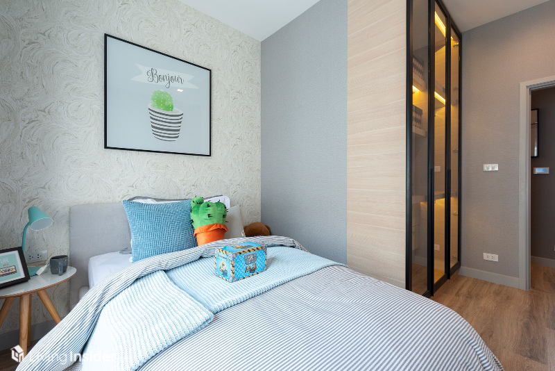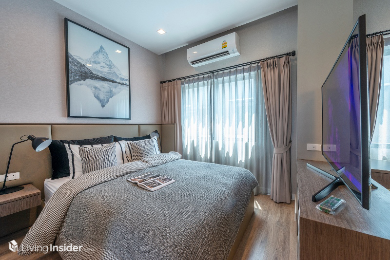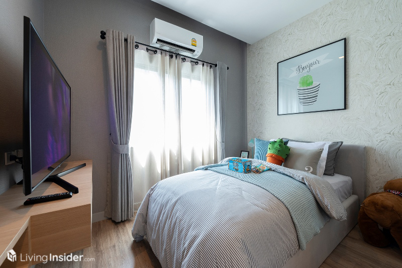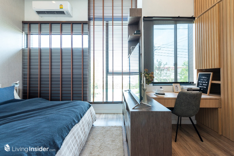Master Bedroom ขนาดกำลังดี วางเตียงขนาด 5 ฟุต โต๊ะทำงานริมหน้าต่าง มีพื้นที่ให้สามารถแขวนทีวีติดผนังได้ มีห้องน้ำในตัวครบ ไม่ต้องใช้ร่วมกับใคร เป็นห้องนอนขนาดกำลังดีครับ อยู่คนเดียวได้สบายๆ