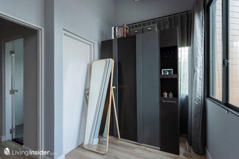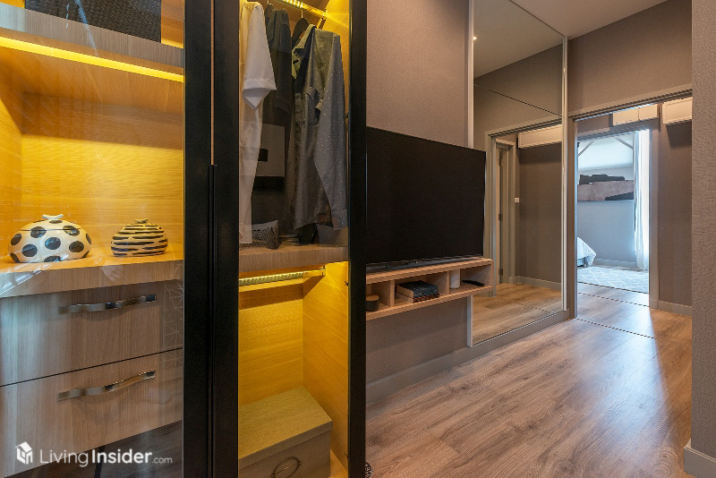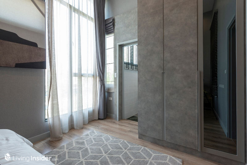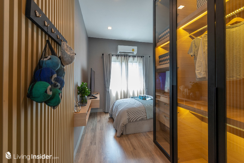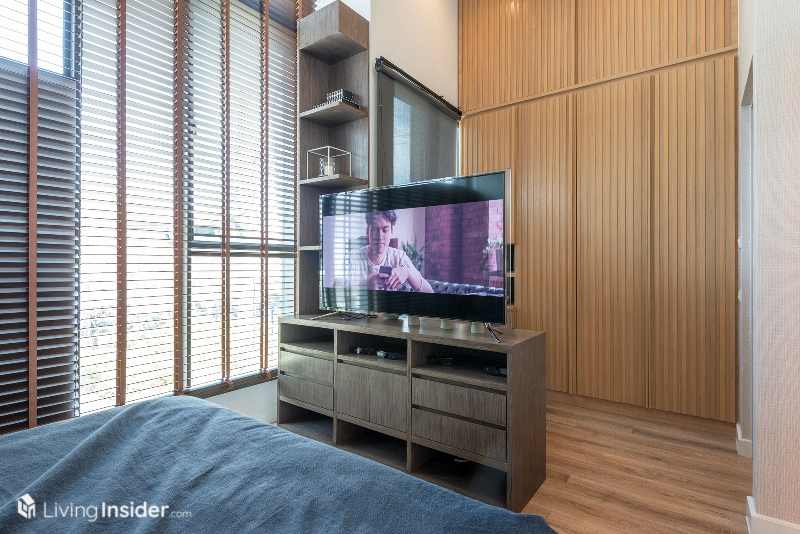 Master Bedroom กว้างขวางทีเดียว วางเตียงขนาด 5 ฟุต ตู้ข้างเตียง ตู้เก็บของที่สามารถวางทีวีได้ พร้อมโต๊ะทำงาน และ Walk-In Closet มุมแต่งตัวแยก สามารถเข้าห้องน้ำจากตรงนี้ได้เลย เป็นห้องนอนที่แบ่งสัดส่วนได้ลงตัวมากๆ ห้องนึง แต่ทีเด็ดเลยอยู่ที่การออกแบบห้องให้มีเพดานสูง High Celing ที่สูงถึง 3.7 เมตรเลยทีเดียว ออกแบบมาให้ห้องดูโปร่ง โล่งขึ้นได้อีกเยอะเลยครับ
