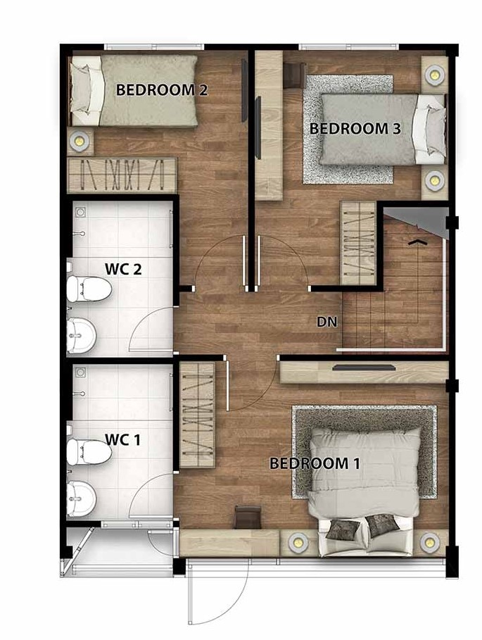 ก้าวขึ้นบันไดชั้น 2 เจอโถงกลางแบ่ง 3 ห้องนอน + 2 ห้องน้ำ มาชม Master Bedroom อันดับแรก