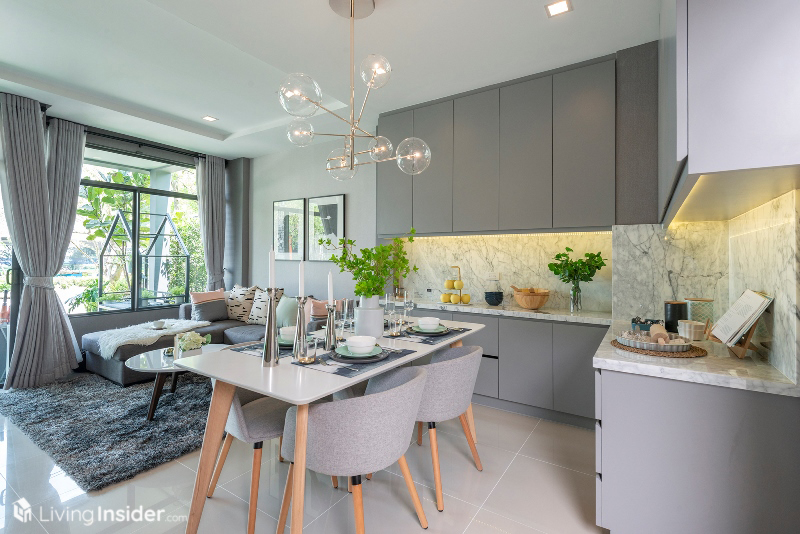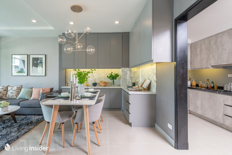 ถัดมาคือ โต๊ะรับประทานอาหาร 3-4 ที่นั่ง บิวท์อิน Pantry ทรง L-Shape ไว้มเตรียมอาหารเช้า ชงชา กาแฟ เพิ่มพื้นที่เก็บของได้มากกว่าเดิม