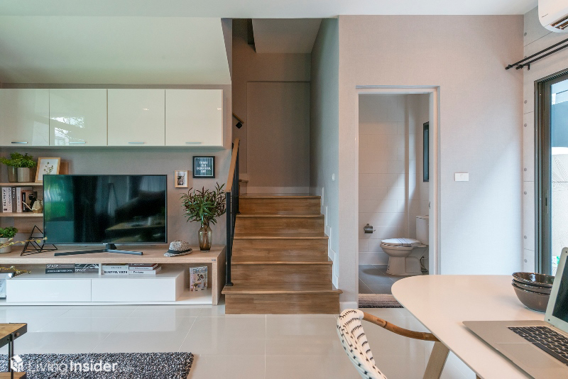 เปิดเข้ามาพบกับ ส่วนนั่งเล่น - รับแขก ที่มีขนาดกว้างกว่าอย่างเห็นได้ชัด สามารถวางโซฟา L-Shape โต๊ะกลาง บิวท์อินชั้นวางของ - ทีวี ระยะสายตา 2.5 เมตร หาทีวีจอใหญ่ๆ มาใช้งานก็ไม่มีปัญหา ส่วนห้องรับแขกของบ้าน Mercer ว่ากว้างแล้ว อันนี้กว้างกว่าแบบจุใจเลยล่ะครับ