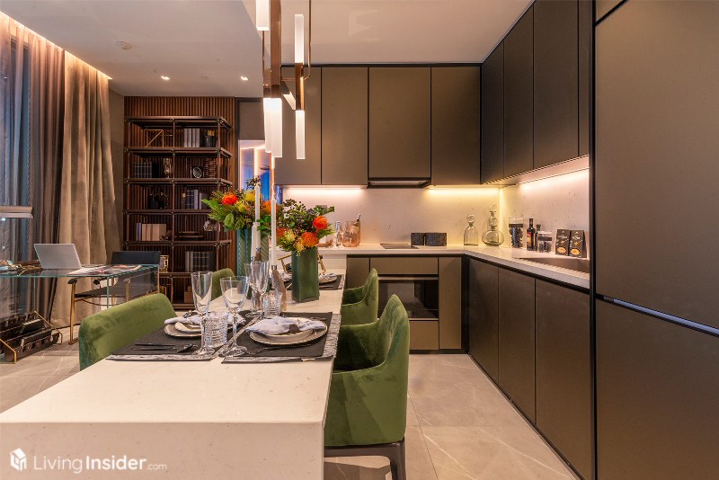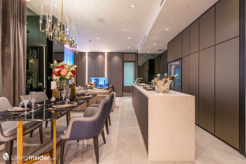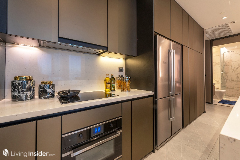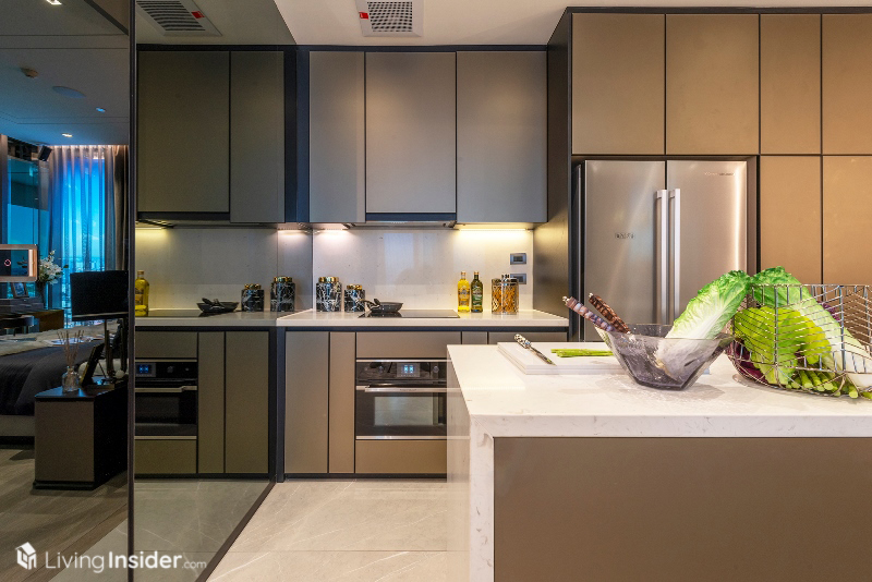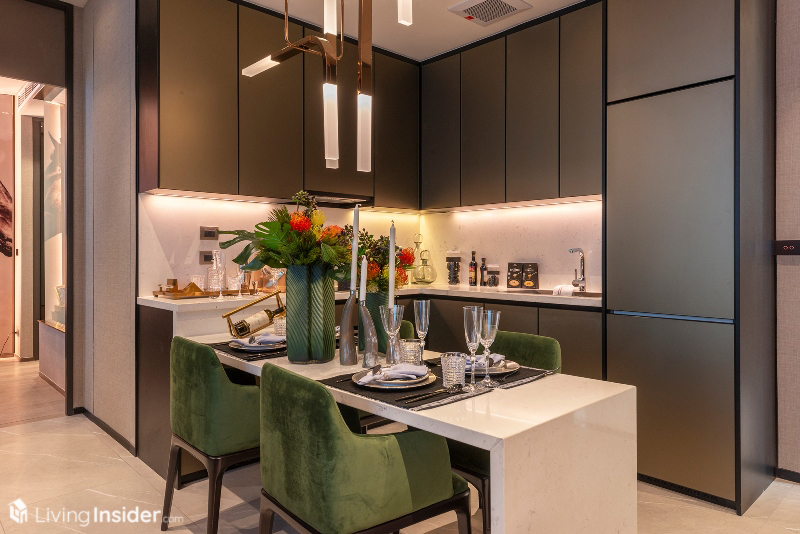ด้านขวาเป็นส่วนครัว Pantry บิวท์อินแบบ L-Shape ขนาดกว้างเช่นเคย พร้อม Counter Bar แนวยาวสำหรับนั่งรับประทานอาหาร โดยส่วนนี้จัดสรรพื้นที่ค่อนข้างลงตัวเลยครับ เหลือพื้นที่ Space ให้เดินได้อย่างสะดวก