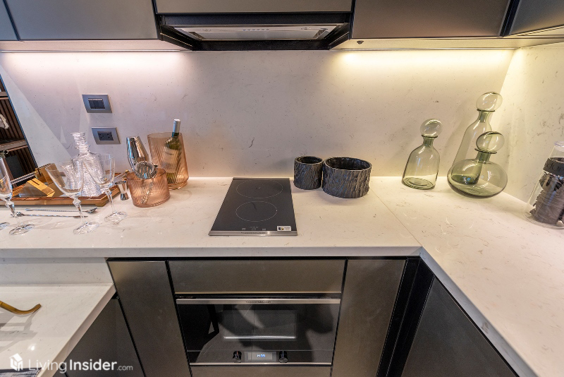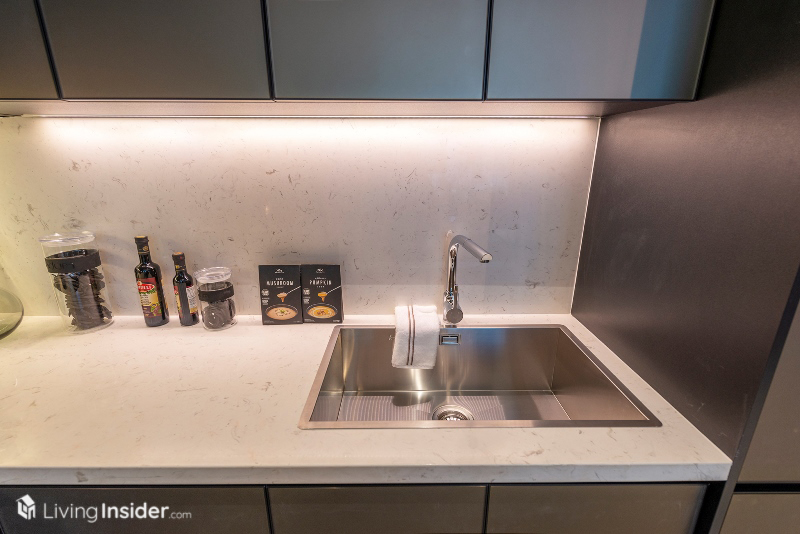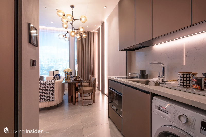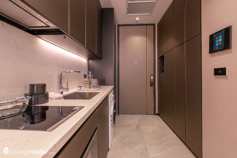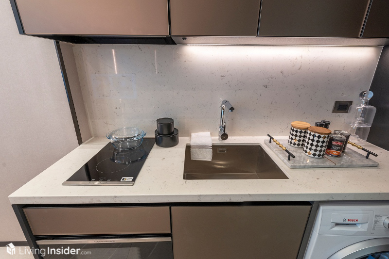 มาในส่วนของห้องแรกกันเปิดเข้ามา พบกับส่วนครัว บิวท์อินตู้เก็บของ - ชั้นวางรองเท้า หน้าบานสีน้ำตาล เช่นเดียวกับ Pantry ครัว Top หินสังเคราะห์ กรุผนังด้วยหินเช่นกัน มีเตาไฟฟ้า เครื่องดูดควัน ซิงค์ล้างจานให้ครบ พร้อมมีช่องให้วางเครื่องซักผ้าฝาหน้า ในส่วนนี้มีพื้นที่กว้างพอให้ประกอบอาหารมื้อเล็กๆ ได้สบาย