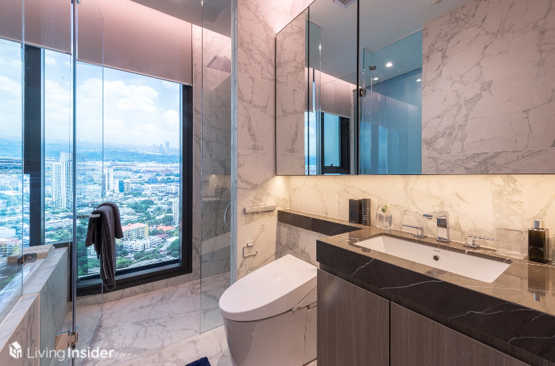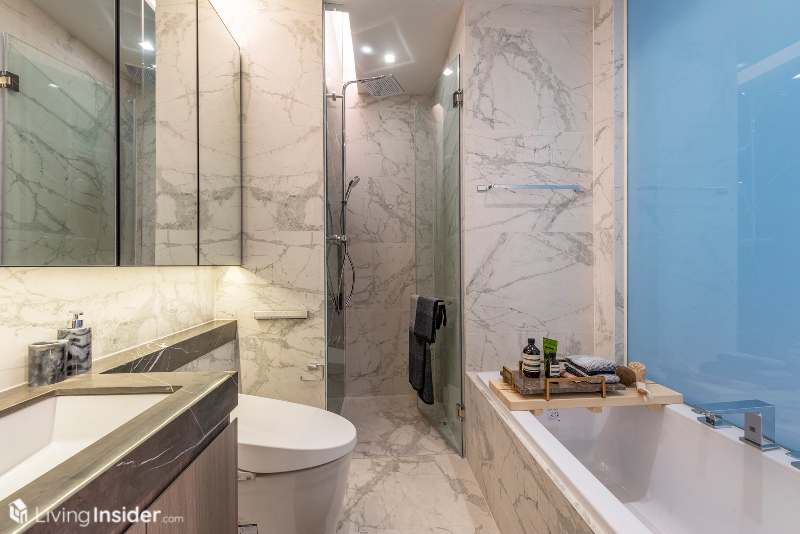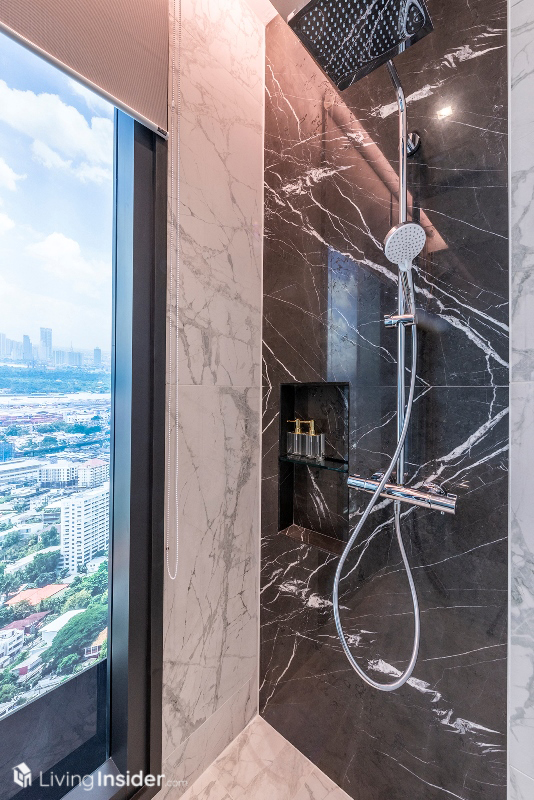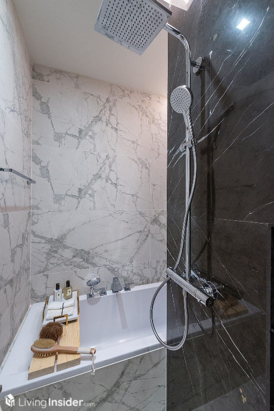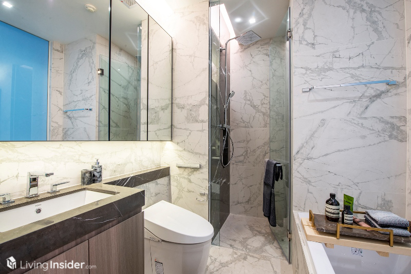 ห้องน้ำมีอ่างอาบน้ำในตัว, Rain Shower เหมือน 1-Bedroom ครับ ตกแต่งด้วยลายหินอ่อน พร้อมกระจกเต็มบ้านช่วยให้ดูกว้างขึ้น และแยกโซนเปียก แห้ง ได้ค่อนข้างลงตัวเลย