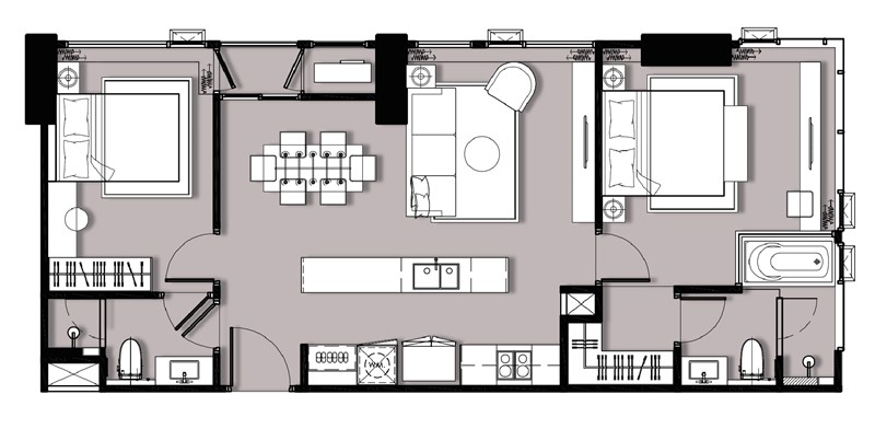 ยูนิต 2-Bedroom + 2-Bath หน้ากว้าง(มาก) แบ่งพื้นที่ 2 ส่วนหลักคือ Common Area กับ Rest Area เหมาะกับกลุ่ม Family (2-4 คน) ต้องการพื้นที่ใช้สอยมาก ไม่อึดอัด Type นี้น่าสนใจทีเดียว