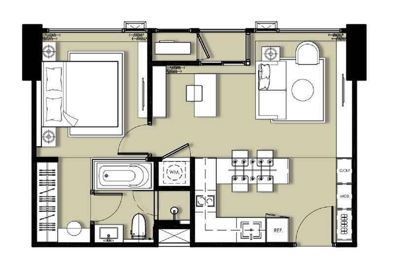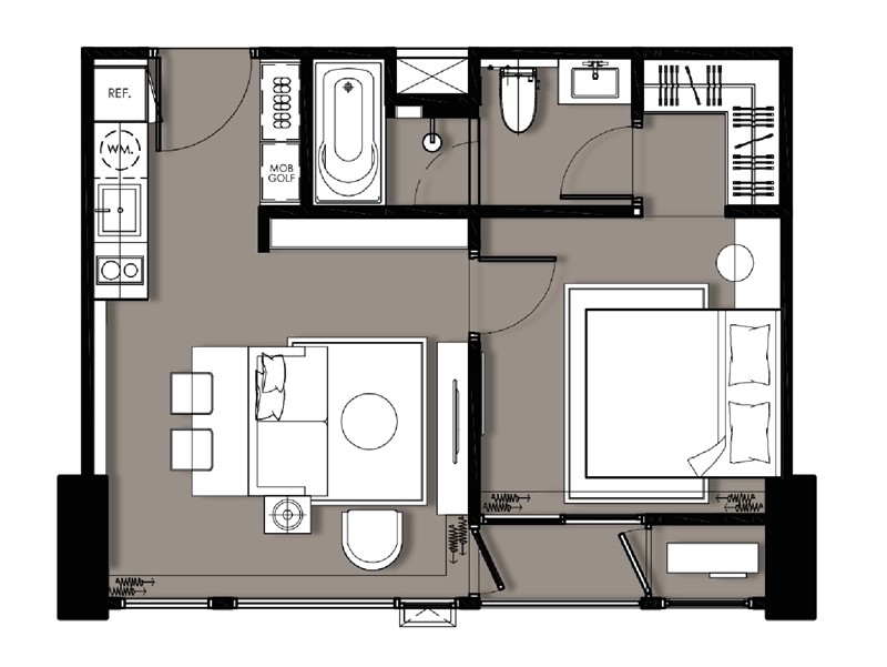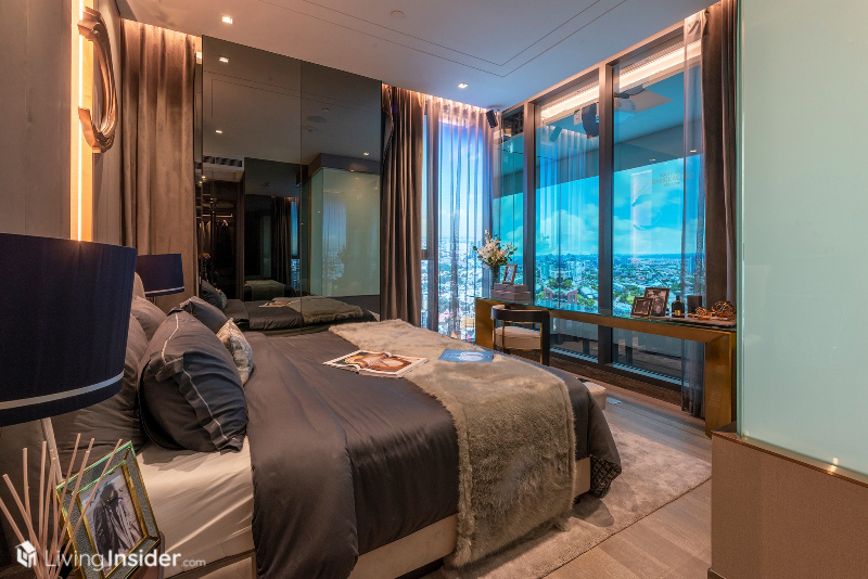 ส่วนของ Bedroom มีพื้นที่วางเตียงขนาด 5 ฟุต และตู้ข้างเตียงได้และยังพอมีพื้นที่ข้างเตียงให้เดินได้อย่างสะดวกครับ พร้อมติดตั้งกระจกแบบ Full High เทควิวภายนอกได้ และยังช่วยให้ห้องนอนปลอดโปร่งขึ้นได้เยอะเลยครับ