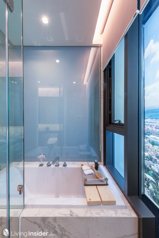 ส่วนห้องน้ำมีอ่างแช่ตัว (Sexy Bath) และแบบ Shower แยกโซนแห้งและเปียกได้อย่างลงตัวครับ โดยห้องน้ำตกแต่งด้วยลายหินอ่อนพร้อมกระจกขนาดเต็มบาน ช่วยเพิ่มความโปร่งให้กับห้องน้ำและใช้เทควิวภายนอกได้ฟินสุดๆ