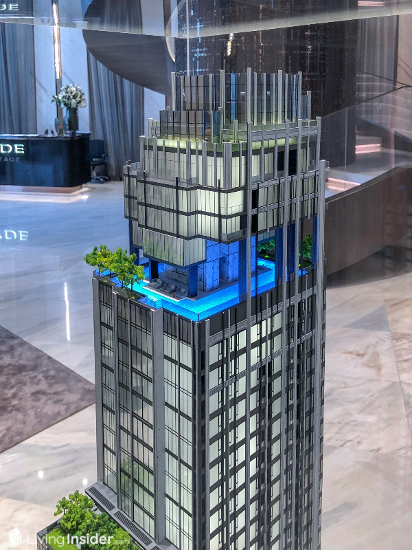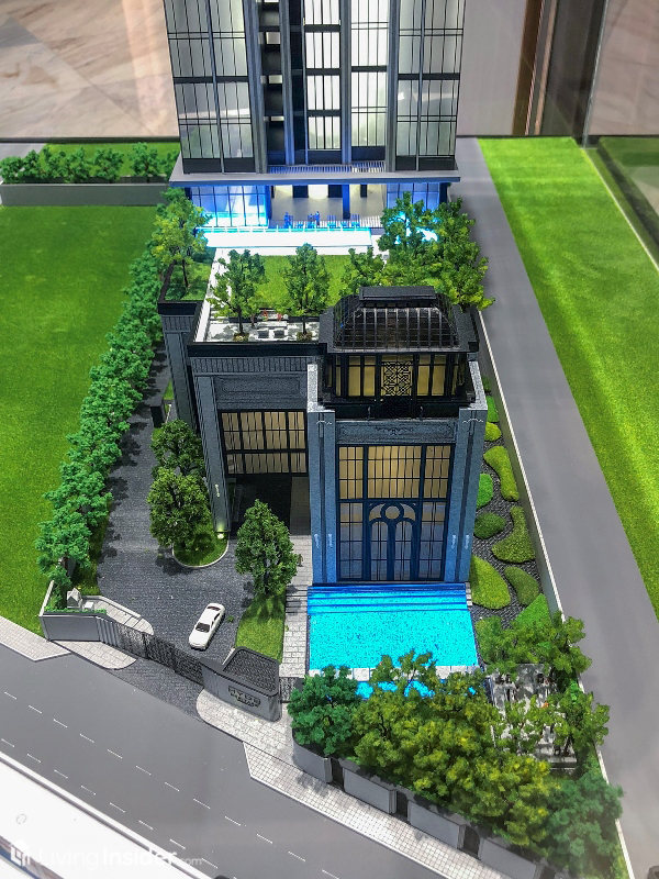 หน้าอาคารมีน้ำพุ (Reflective Pond) และพื้นที่สวน และทางเดินข้างอาคาร (Parterre Walk) ที่เชื่อมต่อส่วน Auto-Parking Area นอกจากนี้ โครงการจัดช่องจอด Super Car 6 คันอีกด้วย