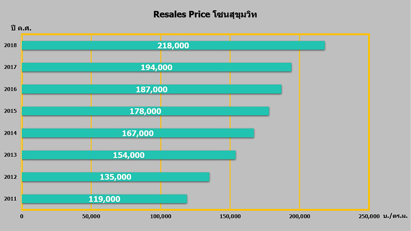 ย้ำนะครับว่าเราต้องเน้นลงทุนในคอนโดที่ราคาคุ้มค่า ที่แม้จะแพงหน่อยแต่ได้อยู่บน ทำเล Super Prime เรามีแต่ได้ประโยชน์ แต่ทุกการลงทุนอยากให้ดูตัวเลขประกอบความคิดเห็นเสมอ เพื่อยืนยันว่าความคิดเราสอดคล้องกับความเป็นจริง ซึ่งจากสถิติราคาคอนโด Resale โซนสุขุมวิทย้อนหลัง 8 ปี จะเห็นว่า ราคาเพิ่มขึ้นจาก 1.2 แสนบาท เป็น 2.2 แสนบาท/ตารางเมตร หรือเพิ่มขึ้นถึง 83%!!!
