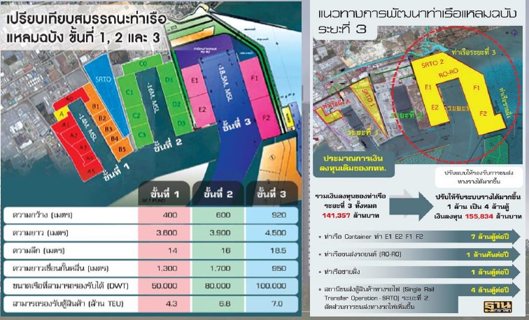 ท่าเรือแหลมฉบัง Phase 3 ที่ใหญ่กว่า Phase ไหนๆ ที่เคยมีมา ด้วยทำเลที่ตั้งอยู่กลางเอเชียตะวันออกเฉียงใต้ ทำให้ EEC เป็นทำเลที่เหมาะอย่างมากต่อการเป็นจุดเชื่อมต่อการขนส่งทางเรือ การขยายตัวของท่าเรือแหลมฉบังจะนำความเจริญมากมาย ทั้งสินค้าที่ขนส่งผ่านแหลมฉบัง คลังสินค้ารอบท่าเรือ และโรงงานผลิตสินค้าส่งออกที่จะสนใจเข้ามาตั้งใน EEC มากขึ้น นั่นหมายถึง เงินกับงานมหาศาลที่กำลังไหลเข้ามาหมุนเวียนในชลบุรีและระยอง