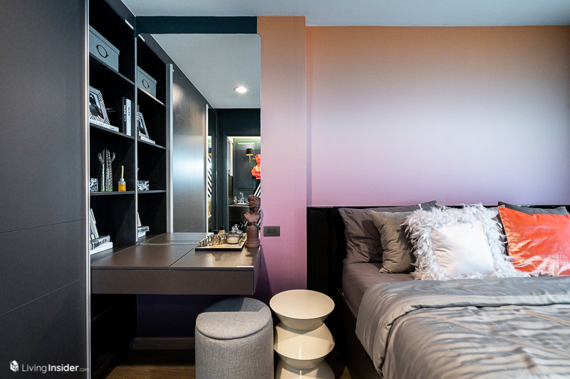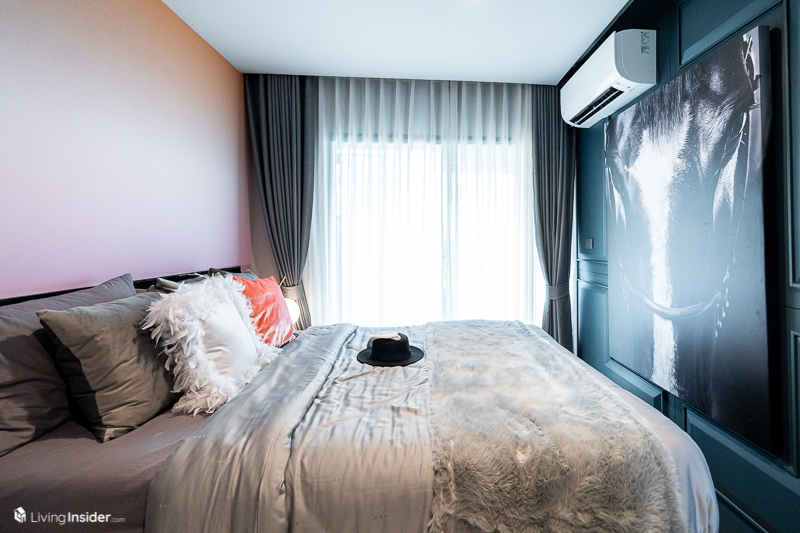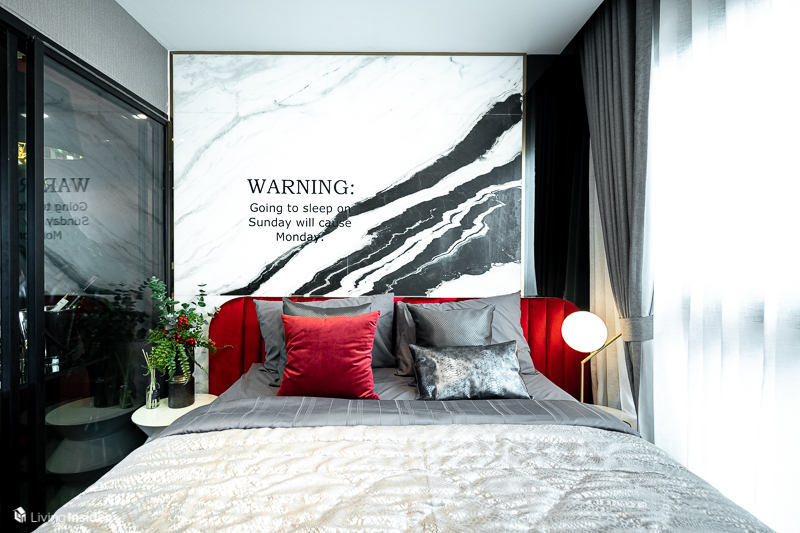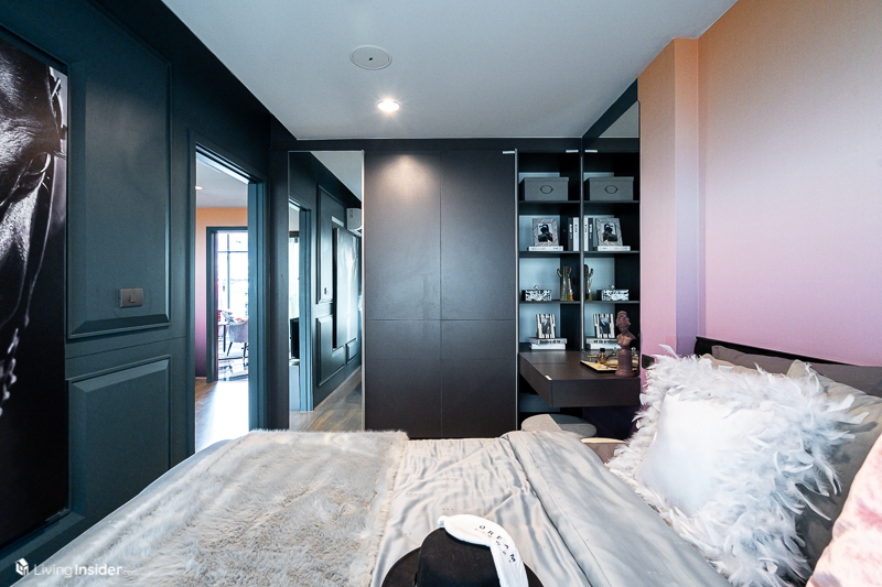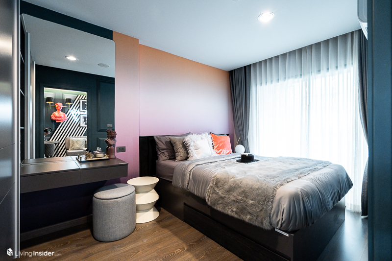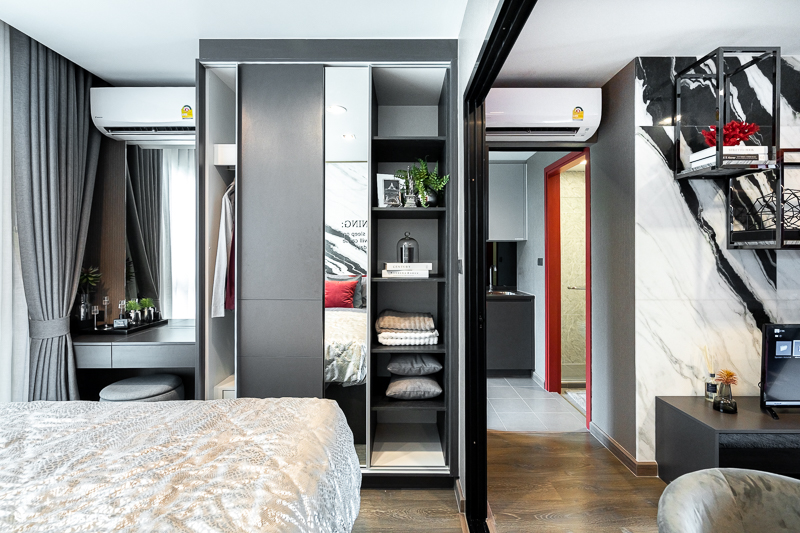ห้องนอนกั้นผนังแยกส่วนเลยสามารถวางเตียงขนาด 5 ฟุตได้อย่างลงตัว พร้อมบิวท์อินตู้เสื้อผ้า โต๊ะแต่งตัวให้ครบ มีขนาดกว้างขึ้น พร้อมหน้าต่างบานหใญ่ให้เทควิวได้เช่นเคย