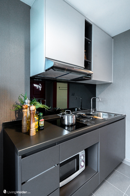 เปิดเข้ามาส่วนครัวจะอยู่ฝั่งขวามือ พร้อม Pantry บิวท์อินครัวเหมือนกับห้องแบบ 1 Bedroom มีช่องให้วางไมโครเวฟ , ตู้เย็นขนาด 2 ประตูได้พอดี ส่วนครัวนี้สามารถประกอบอาหารมื้อเล็กๆ ได้สบายๆและยังมีพื้นที่ค่อนข้างโล่ง