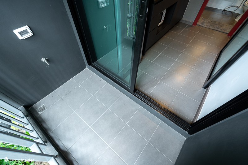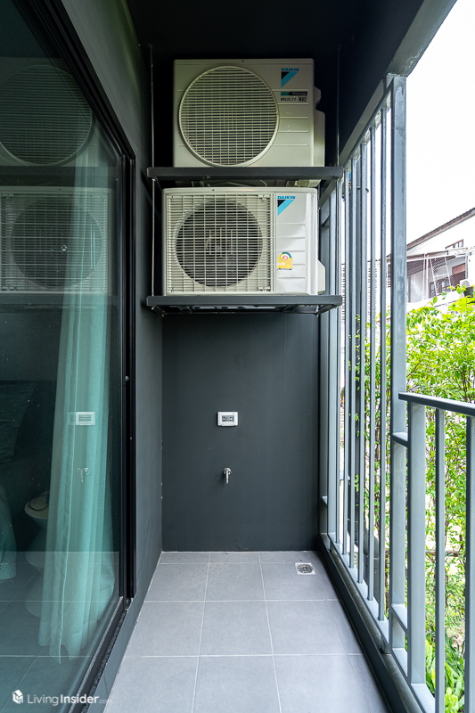 ระเบียงด้านนอกมีพื้นที่สามารถวางเครื่องซักผ้าและตากผ้าได้ พร้อมราวกั้นกันตก ส่วนอีกด้านเป็นที่แขวนคอมเพรสเซอร์แอร์