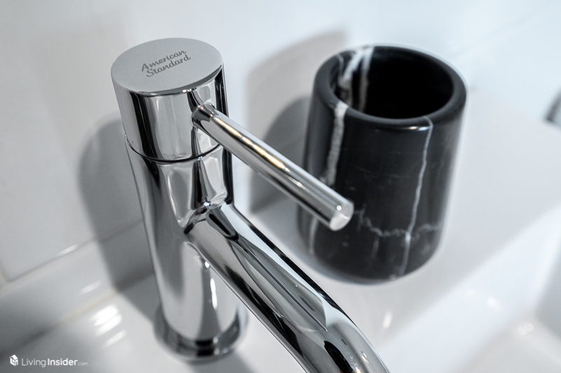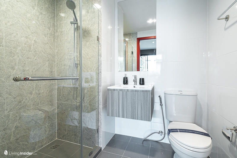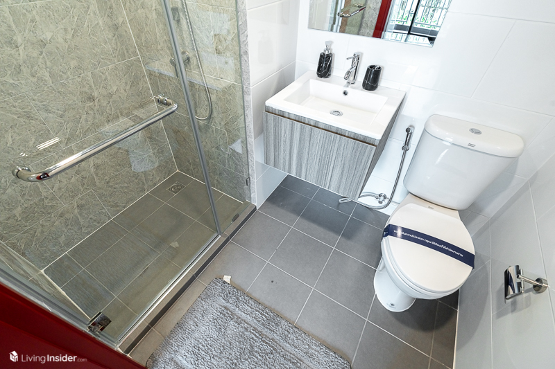 ส่วนห้องน้ำเหมือน 1-Bedroom ครับ ขนาดกว้างกว่าเล็กน้อย บิวท์อินตู้เก็บของใต้อ่าง ฉากกั้นอาบน้ำกระจกนิรภัย สวยงามแบบเรียบๆ