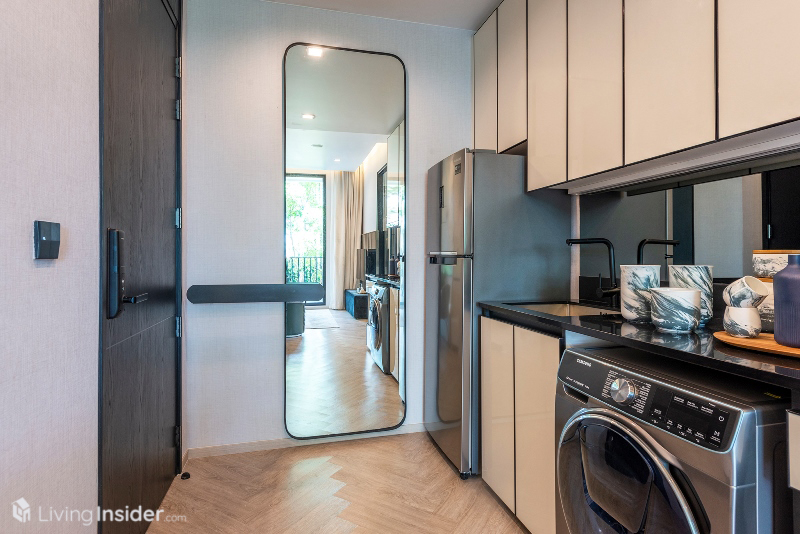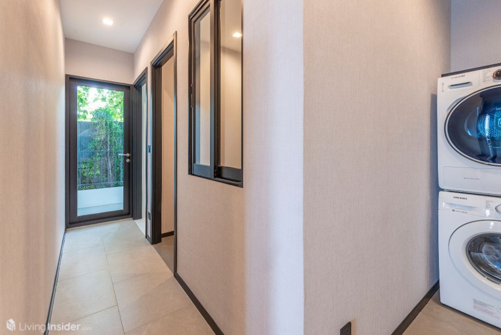 ถัดมาคือส่วนซักล้าง วางเครื่องซักผ้า-อบผ้า พร้อมอ่างซักล้าง ตู้เก็บของใช้ บริเวณนี้สามารถเข้า-ออกผ่านทางเดินหลักอีกทางนึง กรณีไม่อยากรอ Private Lift นะครับ