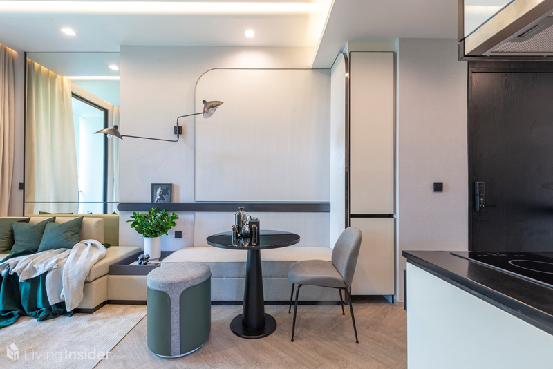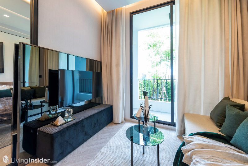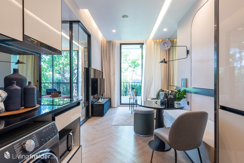 ถัดมาเป็นพื้นที่รับประทานอาหาร และโซฟานั่งเล่น 2 ที่นั่ง พร้อมโต๊ะกลาง ชั้นวางทีวีที่มีระยะห่างสายตากว้างพอตัว รองรับทีวีขนาด 50-55 นิ้วสบายๆ ส่วนนี้จะเชื่อมต่อกับระเบียงห้อง