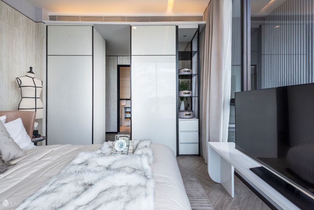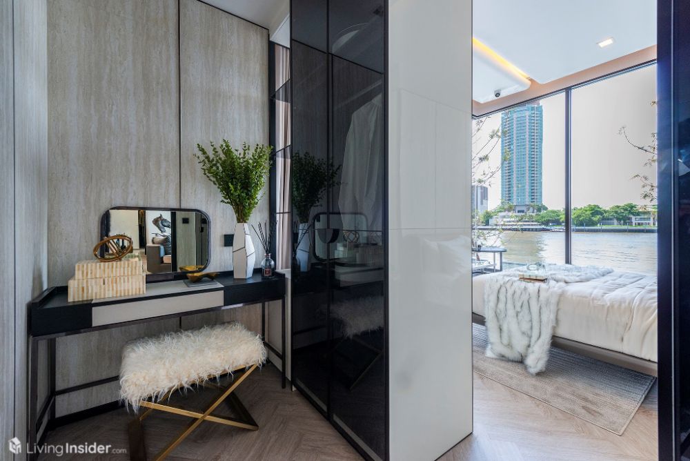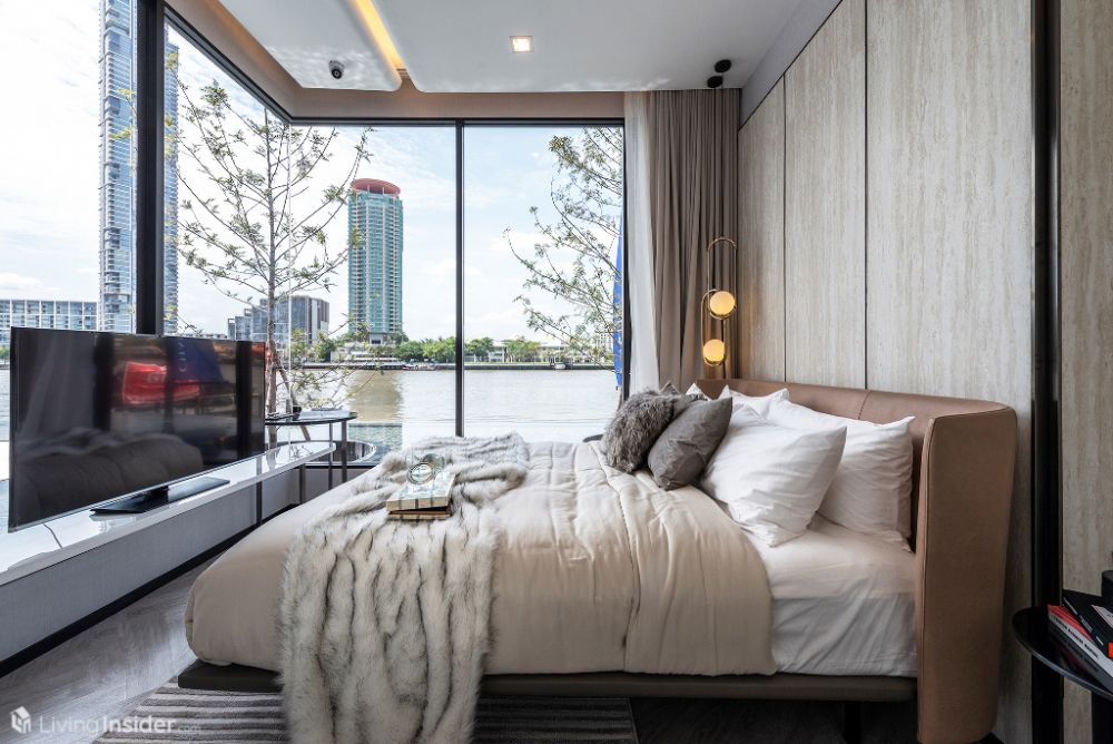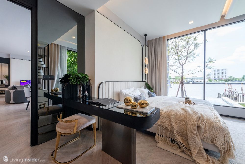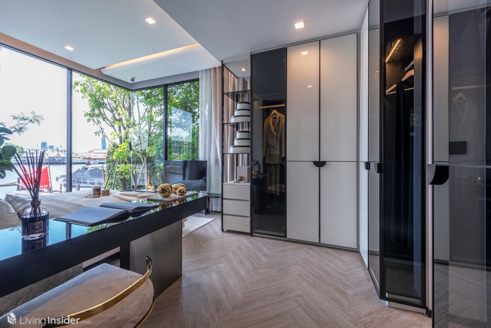 ห้องนอนหลัก (Master Bedroom) วางเตียงขนาด 5 ฟุต + ตู้ข้างเตียง พร้อมตู้เสื้อผ้าบิวท์อิน กระจกห้องนอนเข้ามุม เทควิวเมือง - แม่น้ำเต็มตา