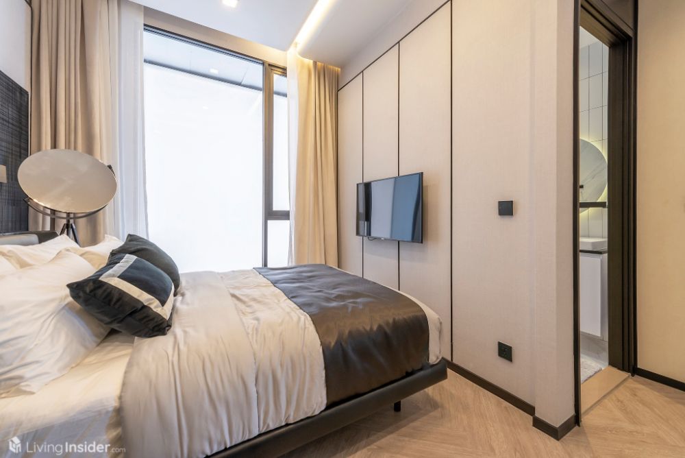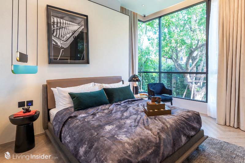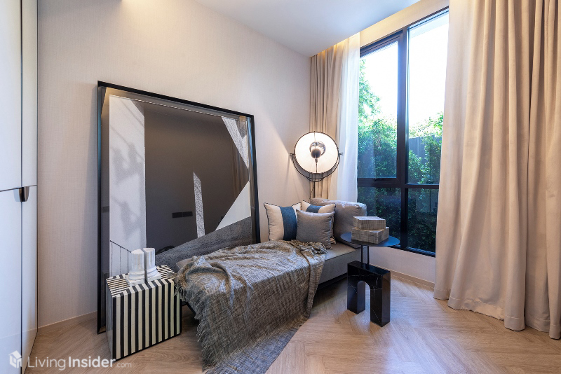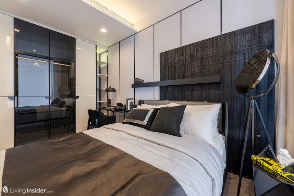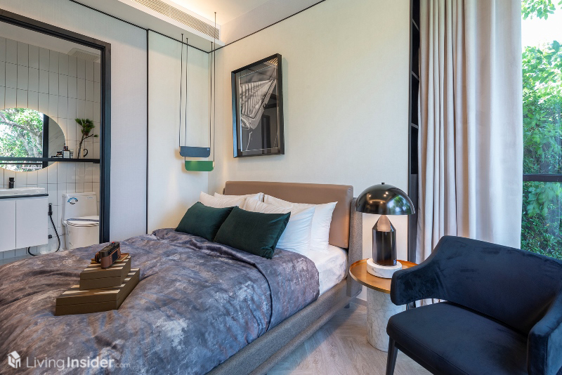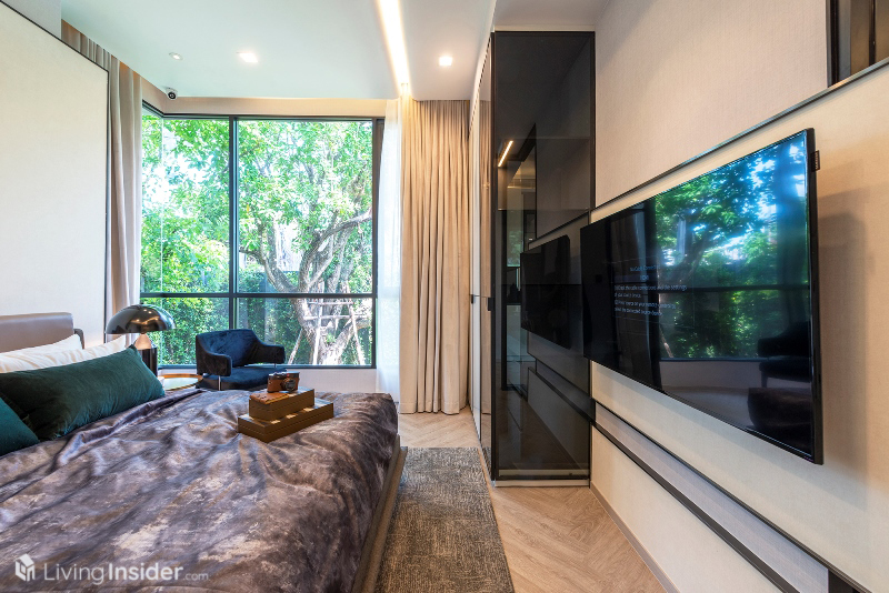 ห้องนอนหลัก (Master Bedroom) วางเตียงขนาด 5 ฟุต + ตู้ข้างเตียง พร้อมตู้เสื้อผ้าบิวท์อิน กระจกห้องนอนเข้ามุม เทควิวเมือง - แม่น้ำเต็มตา