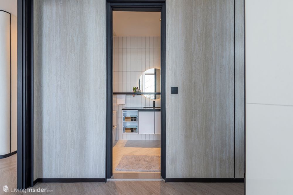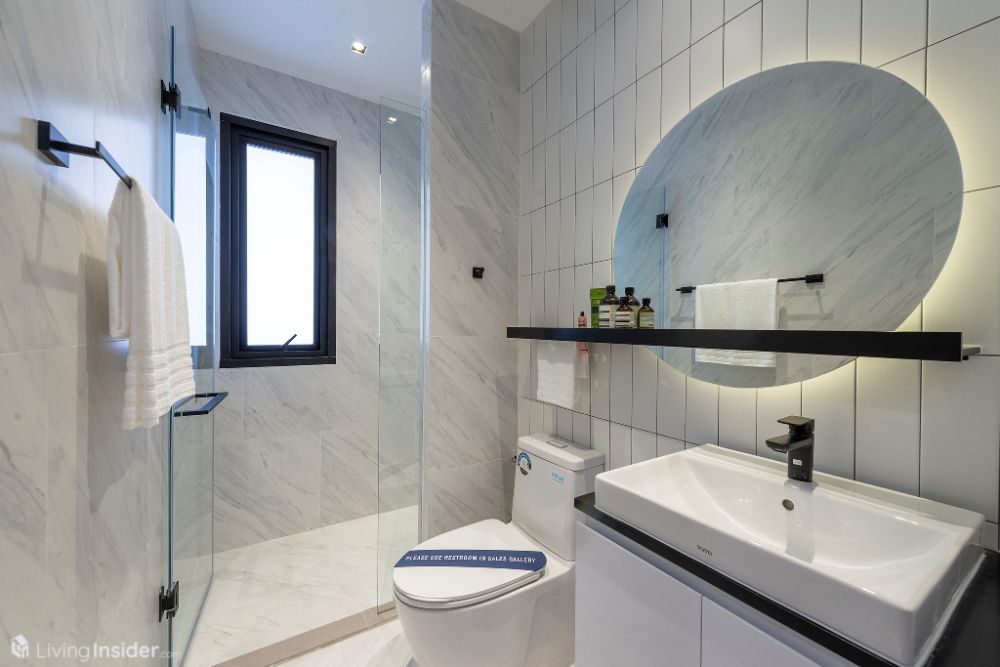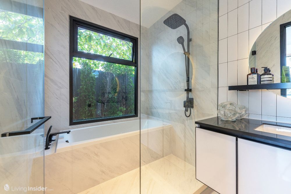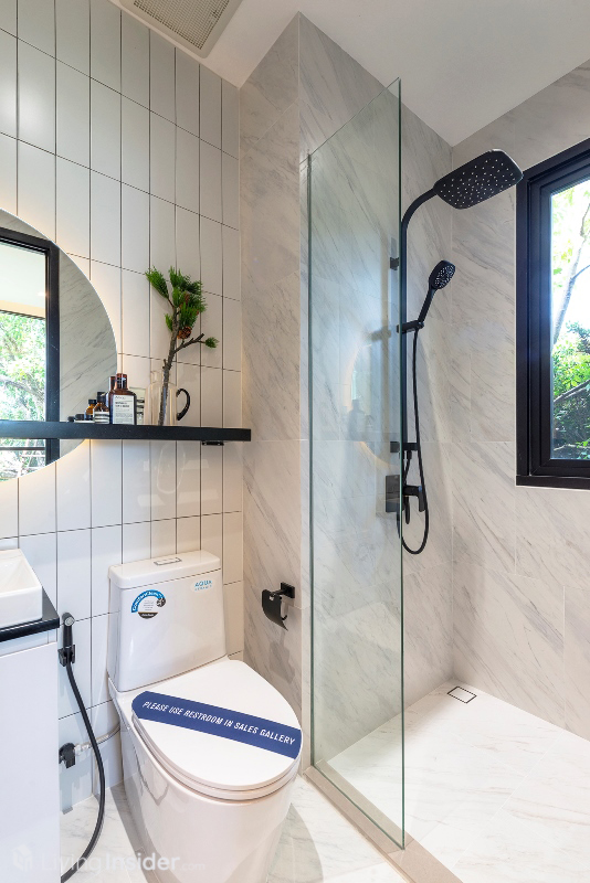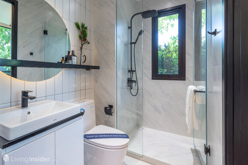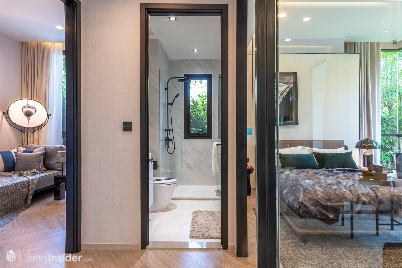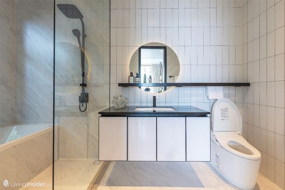 ห้องน้ำมาแบบหรูหรา กรุผนังด้วยหินอ่อน กระเบื้องบางส่วน บิวท์อินตู้เก็บของใต้อ่าง ฉากกั้นกระจกนิรภัย และ Rain Shower สุขภัณฑ์ใช้ของ Toto สามารถเข้าออกผ่าน Master Bedroom และ Living Area สะดวกสบายกำลังดี